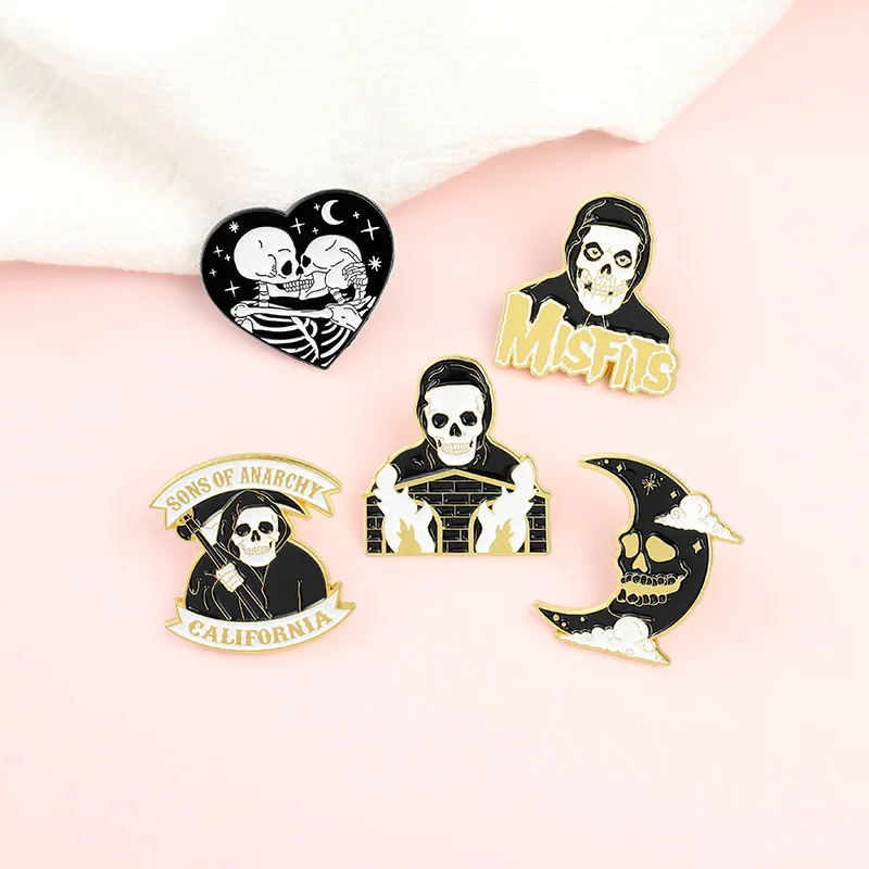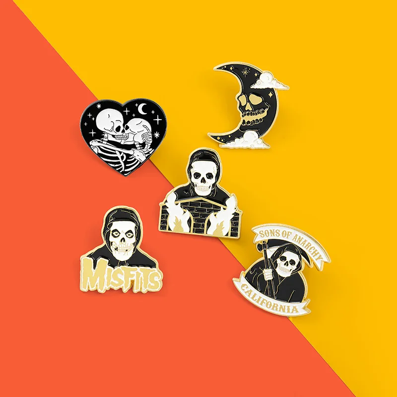 Эмалированная брошь XEDZ для мужчин, в готическом стиле, с изображением скелета, призрака, огня, серпа, маски, звезды, Луны, кости, черная брошь, значок на лацкан