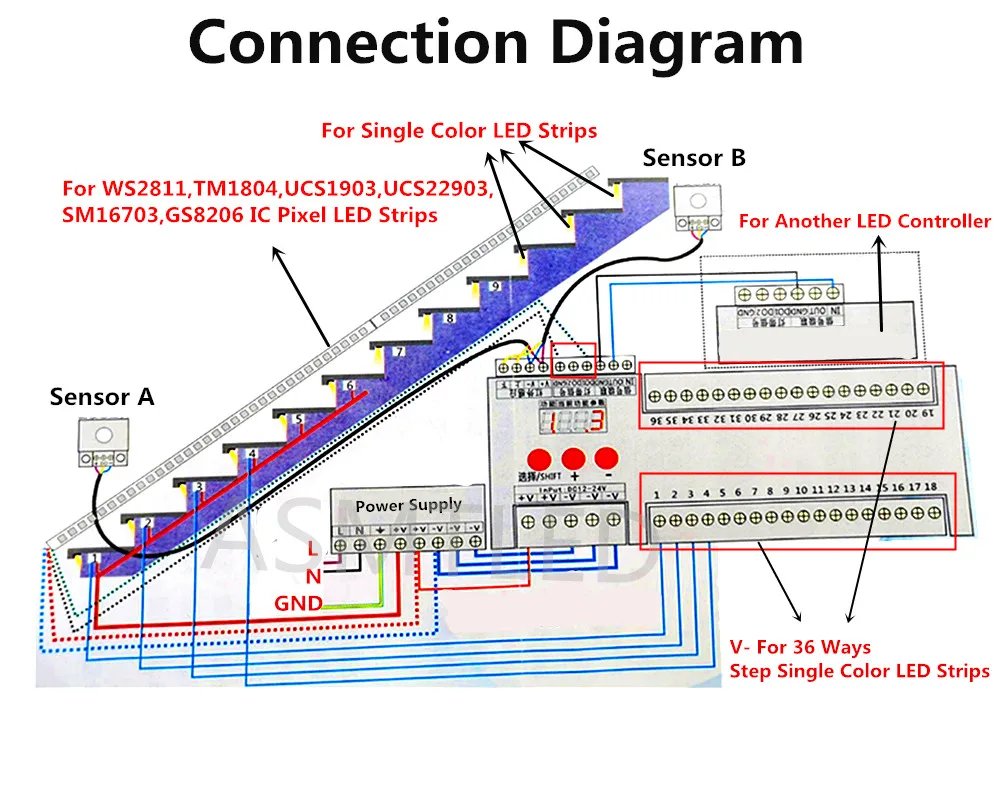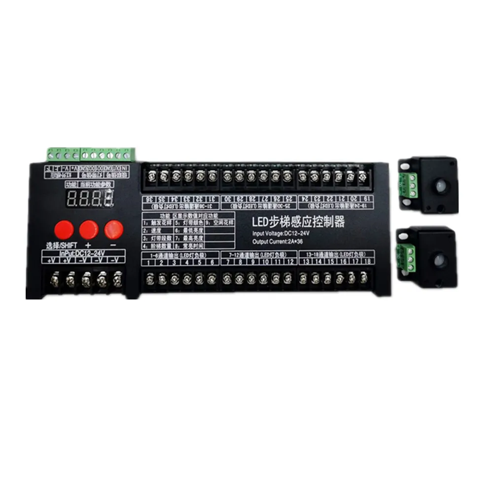 Светодиодная лампа для лестничной клетки, шаговый датчик, контроллер полосы для 2 способов WS2811 1903 16703 пикселей RGB и 36 способов 5050 2835, одноцветные светодиодные ленты