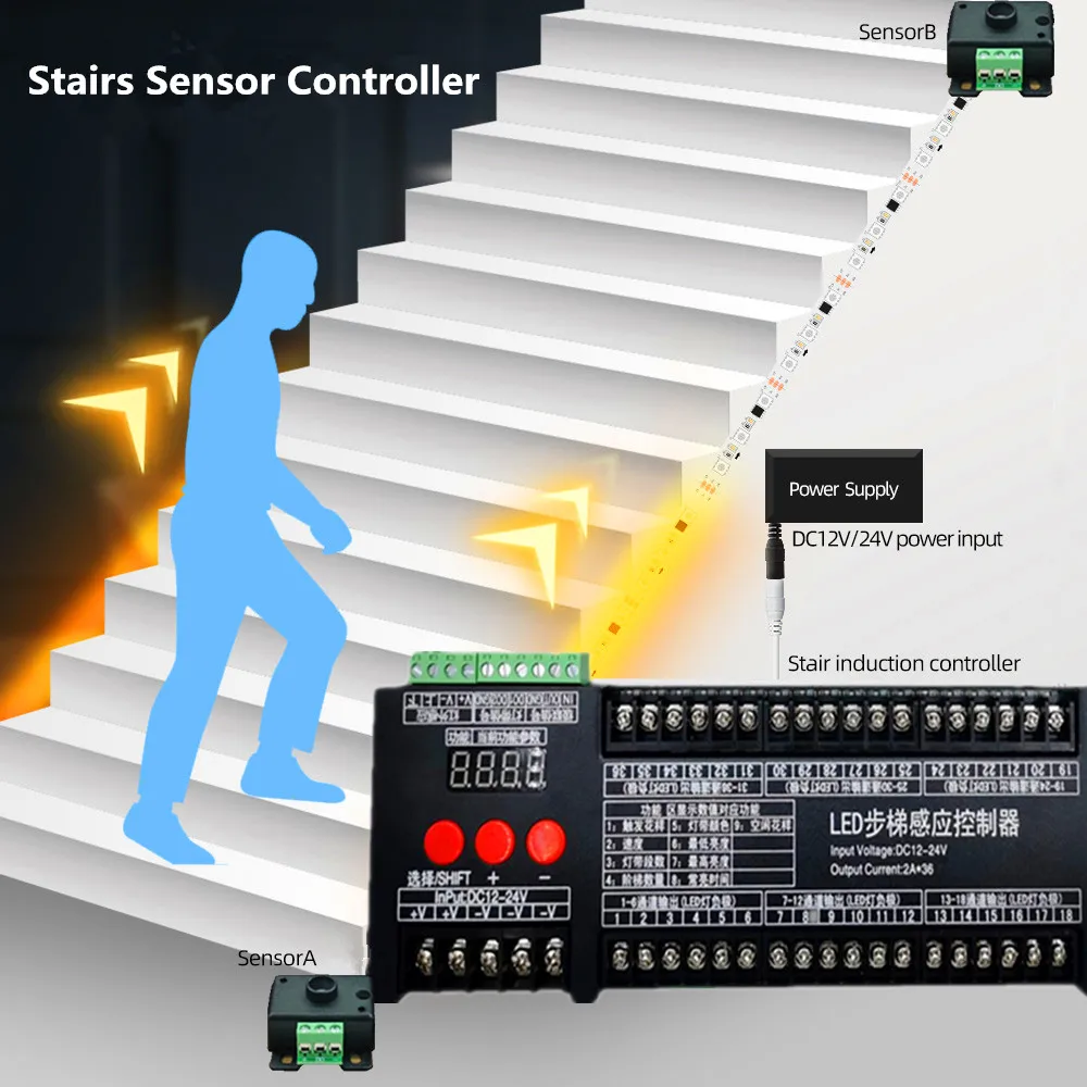 Светодиодная лампа для лестничной клетки контроллер шагового датчика для 2-сторонней WS2811 1903 16703 пикселей RGB и 36 способов 5050 2835 одноцветных светодиодных лент