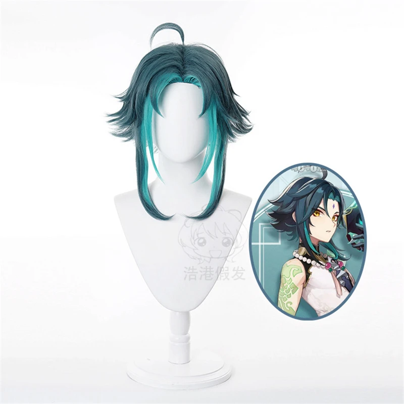 Парик Genshin Impact Xiao для косплея, темно-зеленый, синий, Коротк...