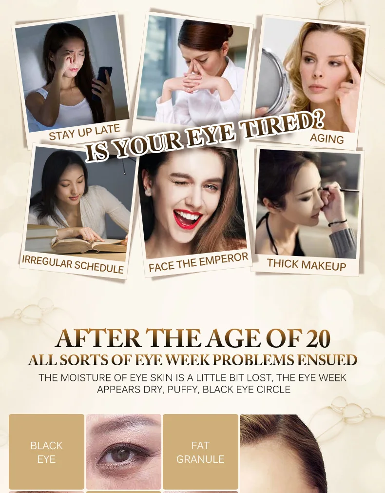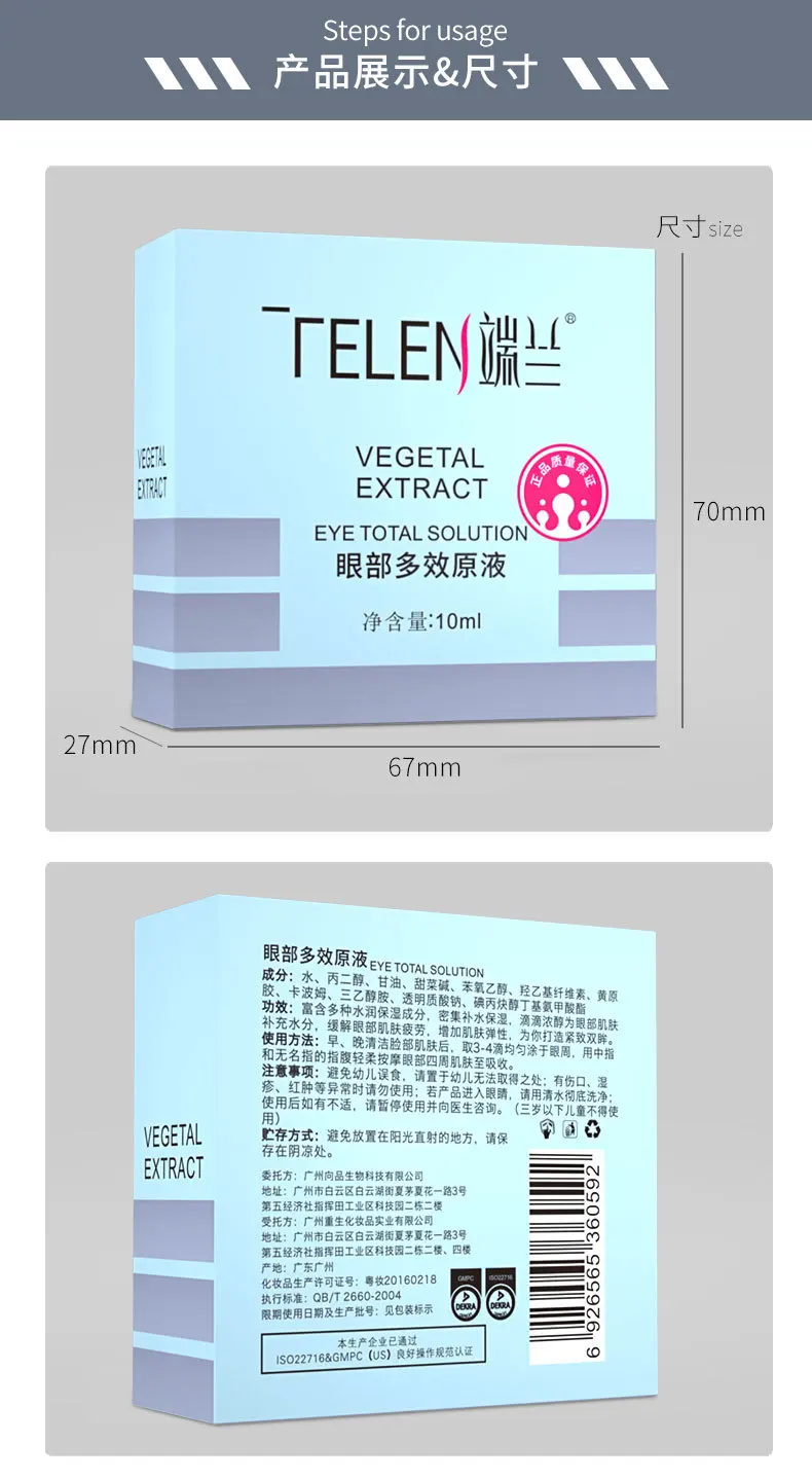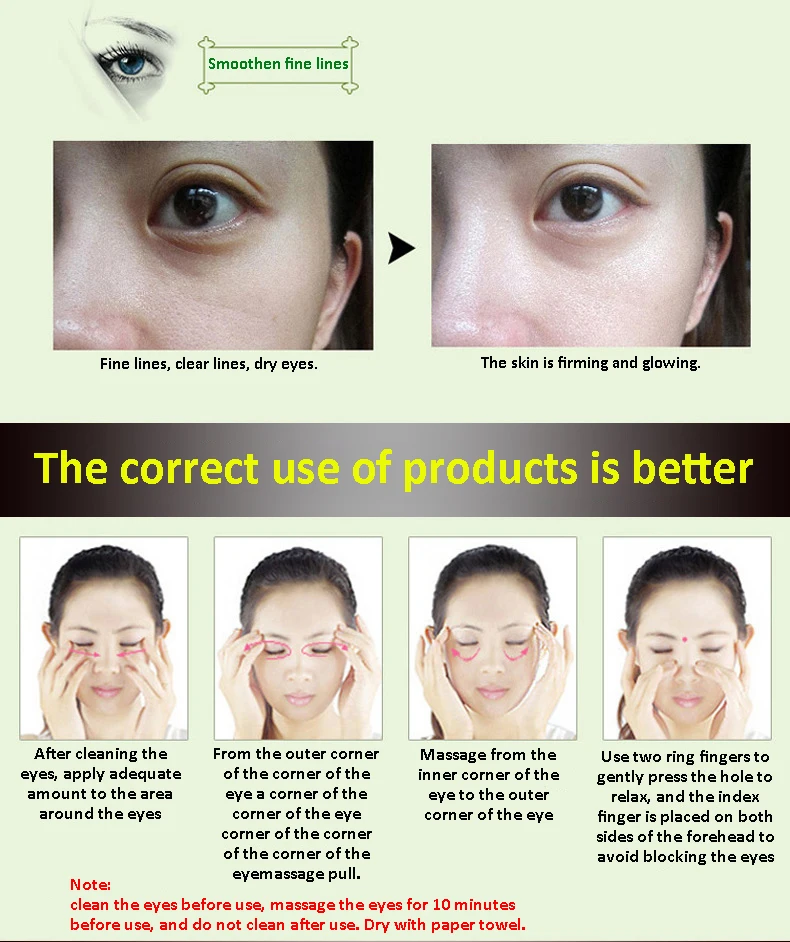 Сочетание богатой травяной эссенции и технологии гиалуроновой кислоты обладает мощной способностью регенерировать и восстанавливать поврежденные клетки кожи. Это может смягчить напряжение кожи вокруг глаз, увлажнить, затянуть и восстановить кожу, уменьшить появление морщин и морщин. В то же время, он имеет функции удаления темных кругов и анти-отечности, анти-старения и ускорения регенерации текстуры кожи, и интенсивно увлажняет сухую кожу.Область применения: подходит для кожи глаз с темными кругами, отечностью, сухими, морщинками и другими проблемами.