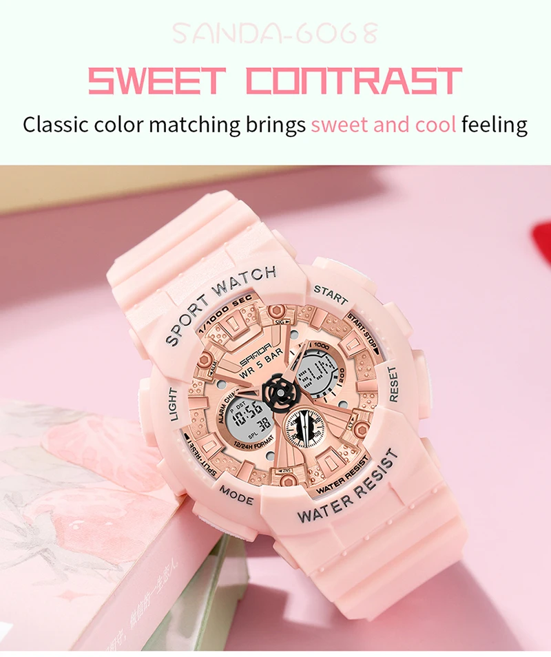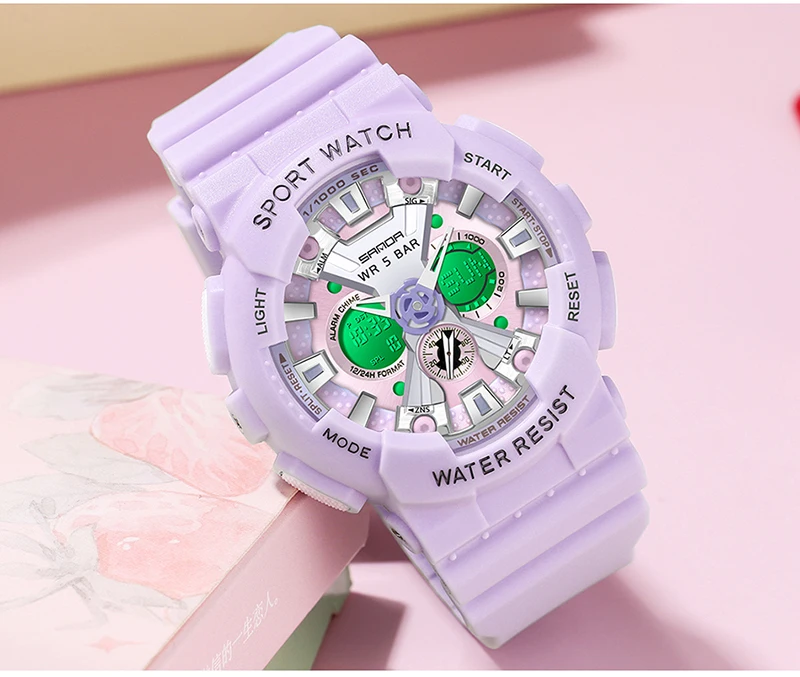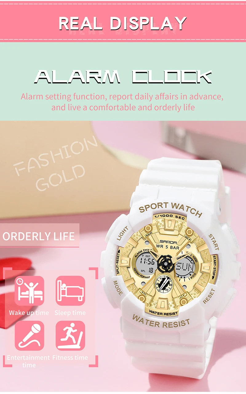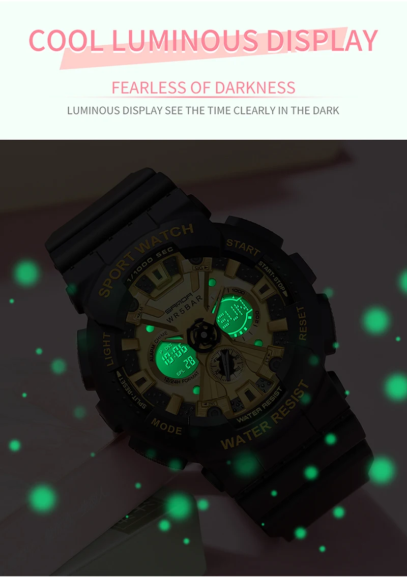 Пол: женщинСтиль: спортивный, модный, повседневныйМеханизм: цифровой механизм и кварцевый механизмМатериал ремешка: ремешок из искусственной кожиТип пряжки: ПряжкаЧасы циферблата: круглыеДиаметр циферблата: 45 ммЧехол Толщина: 16 ммШирина ремешка: 20 ммДлина браслета: 220 ммГлубина водонепроницаемости: 3 АТМФункции: хронограф, светильник, светодиодный дисплей, ударопрочный, дисплей недели, будильник