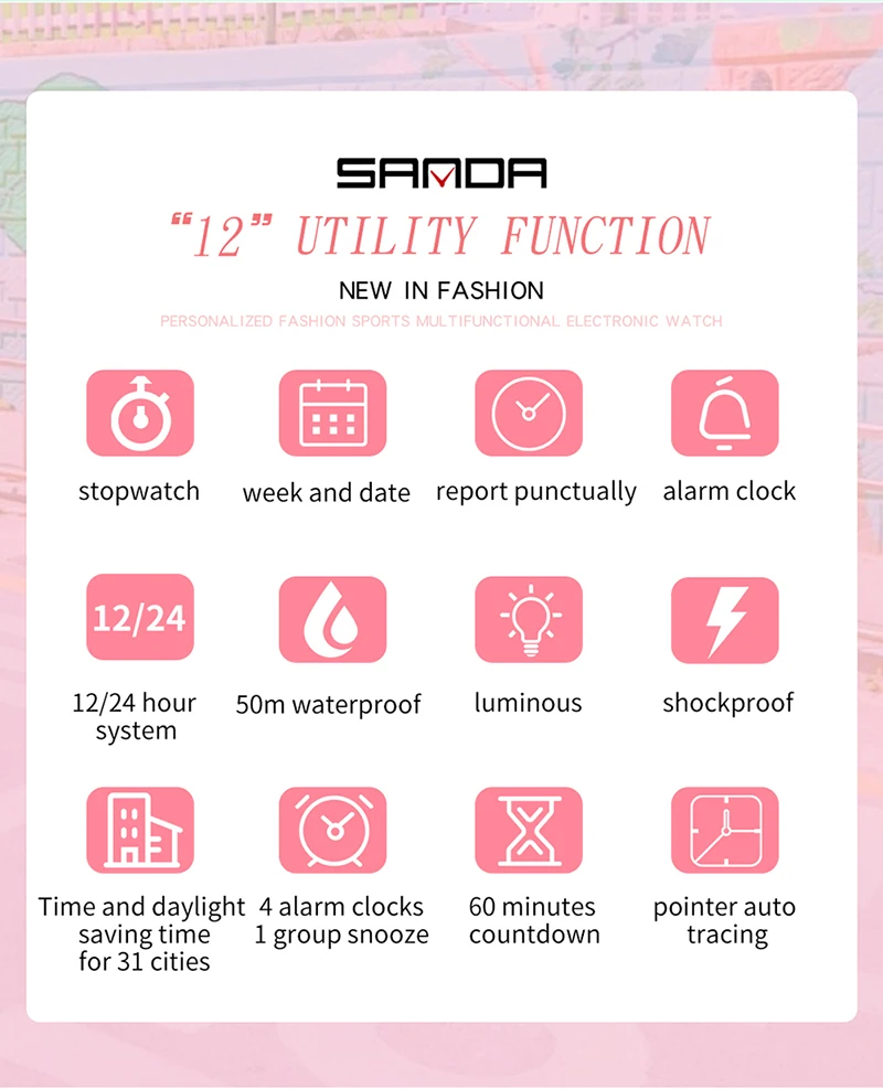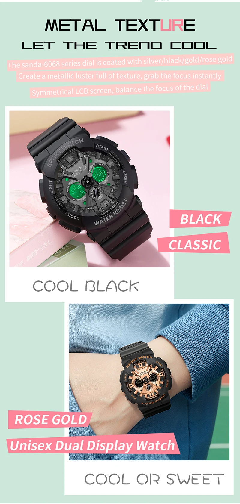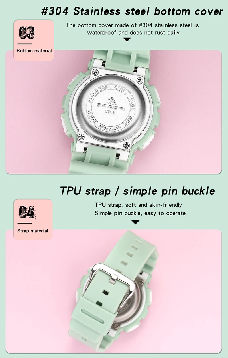 Пол: женщинСтиль: спортивный, модный, повседневныйМеханизм: цифровой механизм и кварцевый механизмМатериал ремешка: ремешок из искусственной кожиТип пряжки: ПряжкаЧасы циферблата: круглыеДиаметр циферблата: 45 ммЧехол Толщина: 16 ммШирина ремешка: 20 ммДлина браслета: 220 ммГлубина водонепроницаемости: 3 АТМФункции: хронограф, светильник, светодиодный дисплей, ударопрочный, дисплей недели, будильник