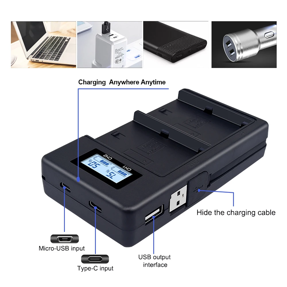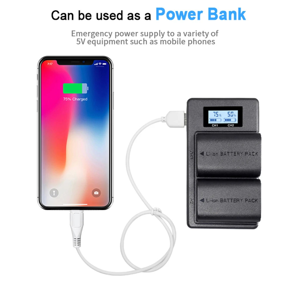 Интеллигентая (ый) ЖК-дисплей дисплей Зарядное устройство: Вход: 5V/2A, Выход: 8,4 V/1000mA * 2. Он может заряжать 2 LP-E6 или LP-E6N одновременно от любого источника питания USB. Когда зарядное устройство включено, ЖК-дисплеи сообщают вам уровень зарядки.