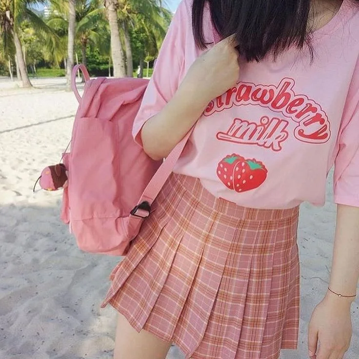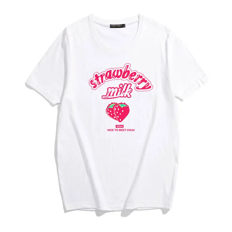 Милая розовая летняя уличная одежда с рисунком клубники и молока для девочек, повседневный топ в японском стиле, милая Повседневная винтажная женская футболка