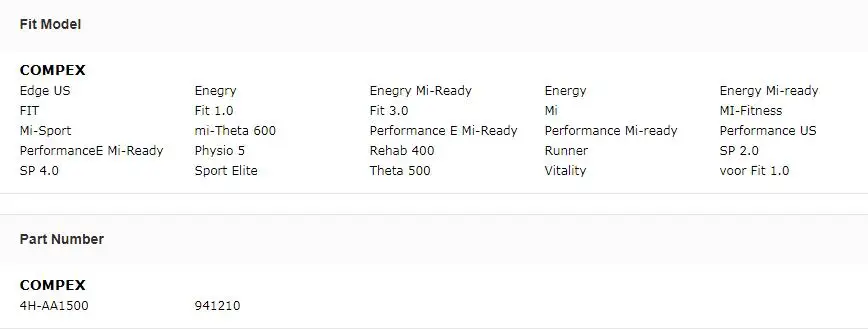 Совместимость с: Compex Edge US, Enegry, Enegry Mi-Ready, Energy, Energy Mi-ready, FIT, Fit 3,0, Mi, MI-Fitness, Mi-Sport, производительность Mi-ready, производительность US, Performance Mi-Ready, Runner, SP 2,0, SP 4,0, Sport Elite, Vitality, voor Fit 1,0
