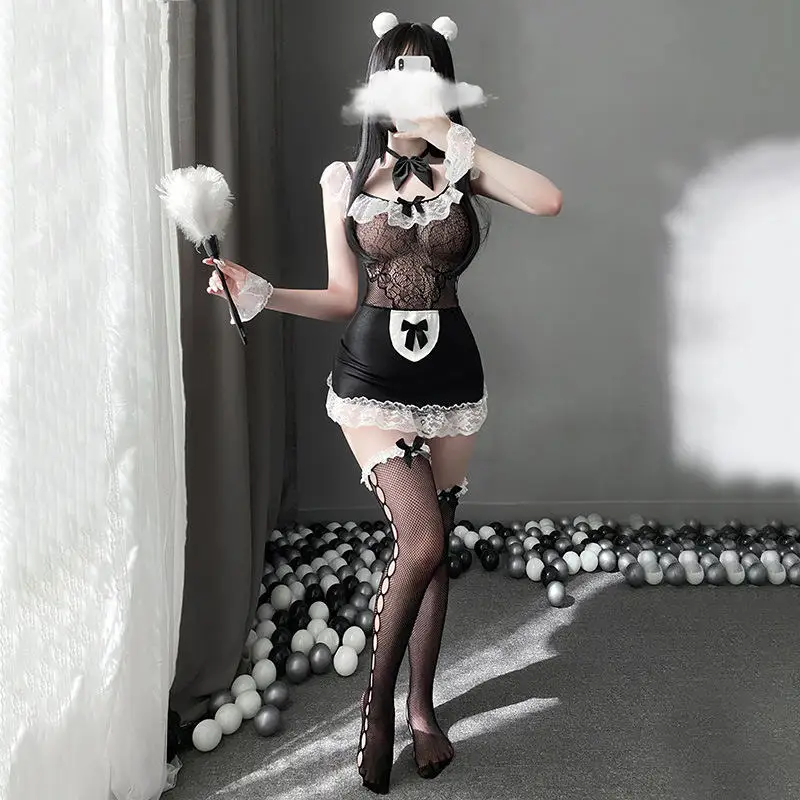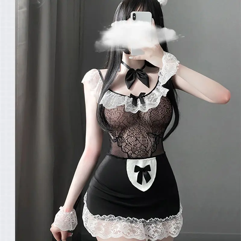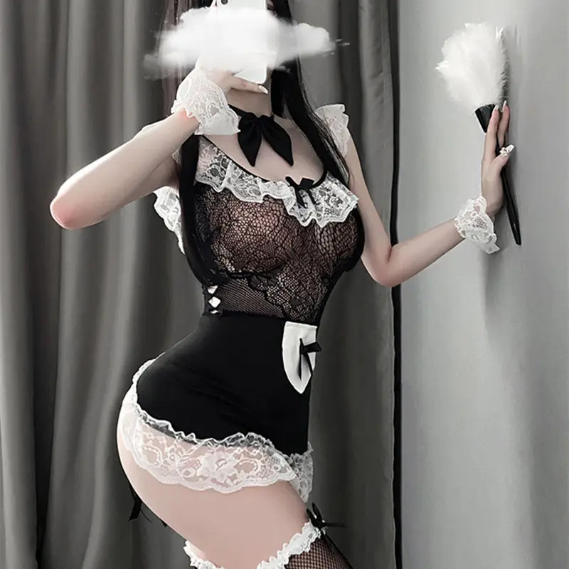 Комплект женского нижнего белья, кружевное Сетчатое платье горничной, с бантом на шее, с высокой талией, с разрезом на бедрах и бахромой, форма с чулками комплектов