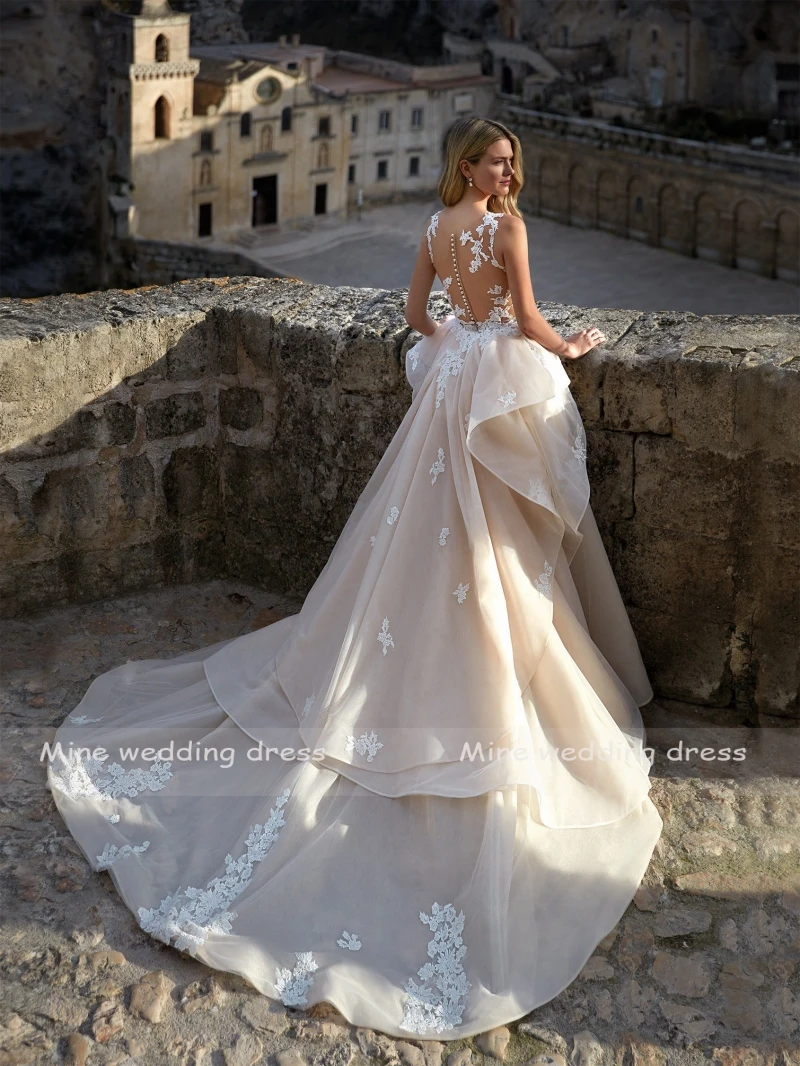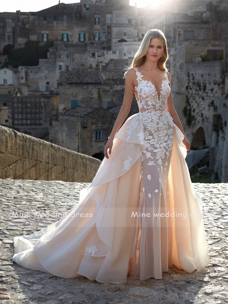 Элегантное свадебное платье-Русалка 2 в 1 с V-образным вырезом, Тюлевое платье цвета шампанского со съемным шлейфом, кружевные свадебные платья без рукавов