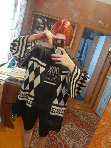 Ткань лёгкая, тонкая. На свету просвечивает , но вплотную не так уж и видно. Вообще заказом вроде довольна, но есть маленькие недочёты. Шов, что заходит в них рукава был немного подпорчен, но ничего страшного) Качество 4/5 вообщем. Заказывала размер XL, по соответствует написанному в описании. The fabric is lightweight, thin. It shines through in the light, but it's not so close to it. In general, I seem to be happy with the order, but there are small flaws. The seam that goes into the sleeves was a little spoiled, but it's okay) Quality 4/5 in general. Ordered size XL, according to what is written in the description. Сохранность :5/5 Вид (т. е, соответствие между картинкой и реал.) 4.8/5 Немного подпорчен рукав и одна из проблем пятнышко. (ну на камере почти не видно) И так тоже не заметно, но я перфекционист. Качество :4/5 Запаха никакого не было, все пришло в сроки (точно в сроки) State of preservation: 5/5 View (i.e., the correspondence between the picture and the re