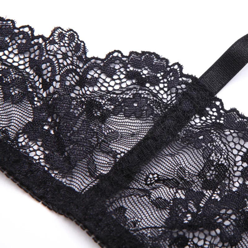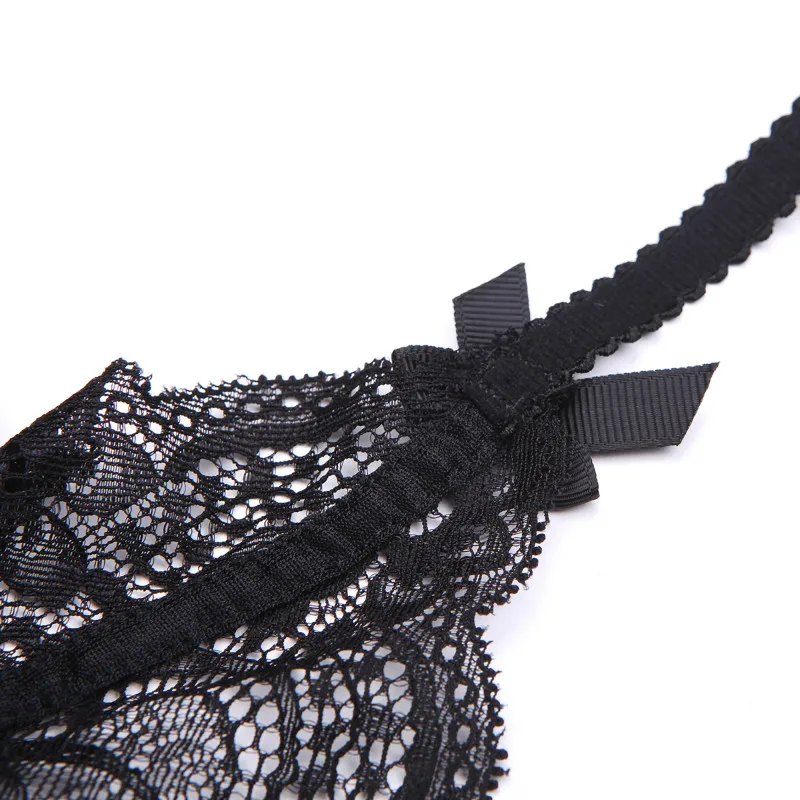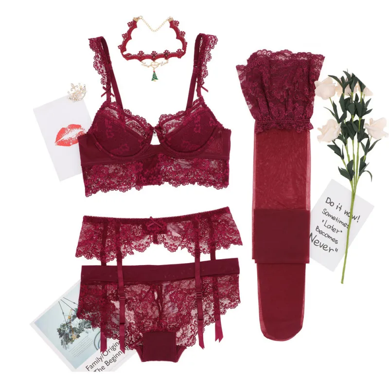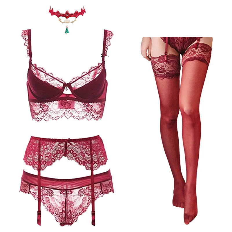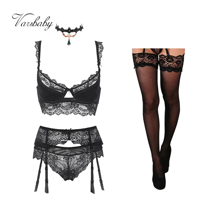 Varsbabyоптовая продажа, черный сексуальный кружевной комплект с бюстгальтером пуш-ап, бюстгальтер + трусики + пояс подвязки + чулки + ожерелье, рождественское нижнее белье