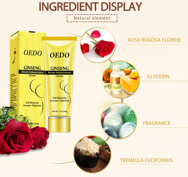 Эффективный крем для увеличения груди, с экстрактом женьшеня. Бренд OEDO. Обеспечивает уход за грудью, придает упругость и эластичность. Крем розового цвета, нежный аромат, мягкая текстура, легко впитывается и глубоко проникает. Улучшает состояние груди, питает, придает объем. В составе-экстракт белой ивы, экстракт тримеллы, шиповника. Рекомендуется наносить равномерно на обе груди каждый вечер после принятия душа. Отличный инструмент! Хороший результат! Рекомендуем!