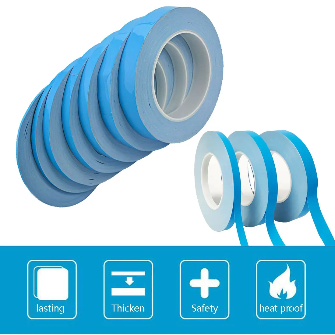 Параметры: Цвет: синий Толщина: 0,2 мм Ширина: 3/5/7/8/10/15/20/25 мм Длина: 25 м/рулон Адгезия: 1,3 кг/дюйм Теплопроводность: 1,5 Вт/мК Напряжение пробоя: 4 кВ Долгосрочная термостойкость: 120 градусов Цельсия Кратковременная термостойкость: 180 °C Применение: Используется для подключения радиатора к ЦПУ, светодиодный высокой мощности, ОЗУ видеокарты, модули памяти DDR и другие Полупроводники питания.
