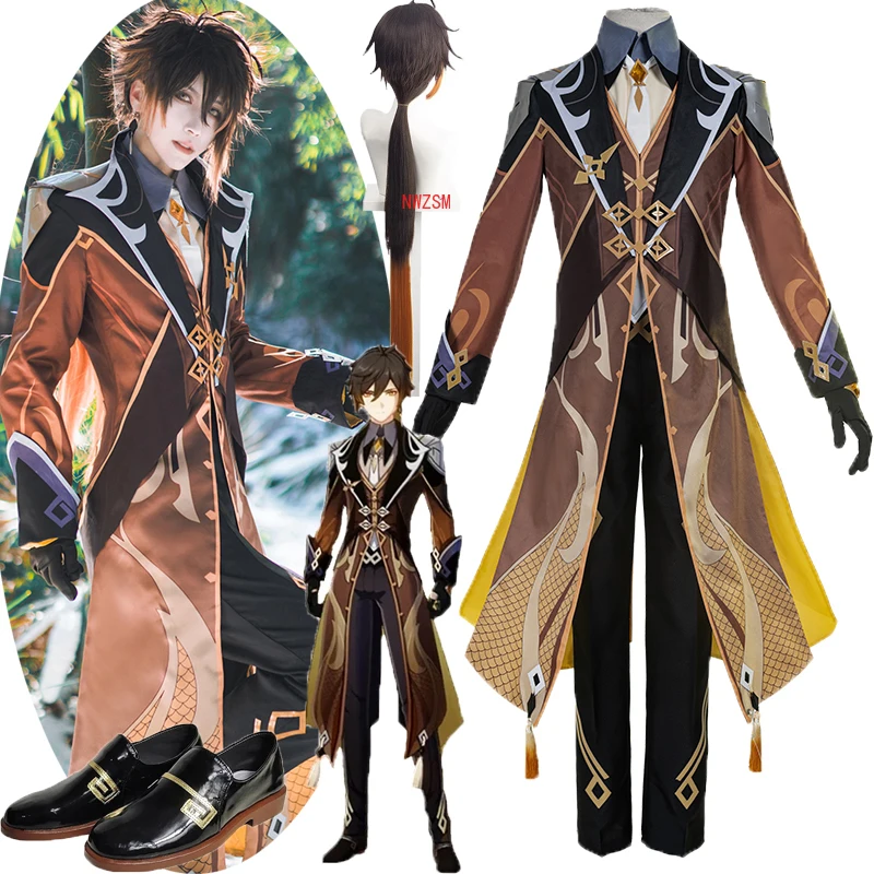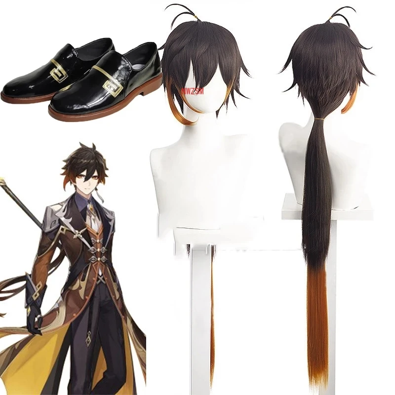 Костюм Чжун ли для косплея по мотивам игры Genshin Impact, длиной 90 см, парик коричневого и оранжевого цвета из аниме парик и обувь для косплея