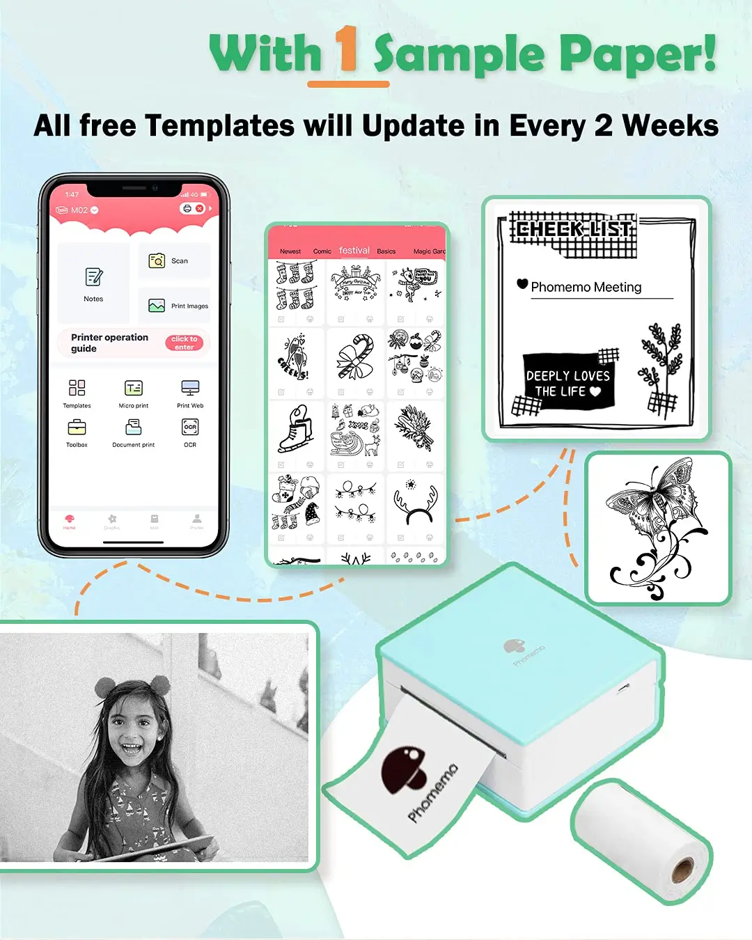 Phomemo M02 Портативный принтер 203 dpi Беспроводной Bluetooth-совместимый термальный мини-карман 53 мм Фото Мобильный принтер для домашнего офиса