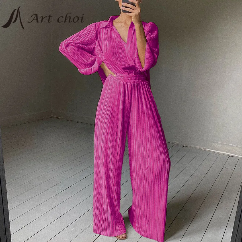 Женский спортивный костюм из двух предметов, повседневная бежевая рубашка и Длинная блузка с плиссированными широкими штанинами, комплект из 2 предметов для весны и лета