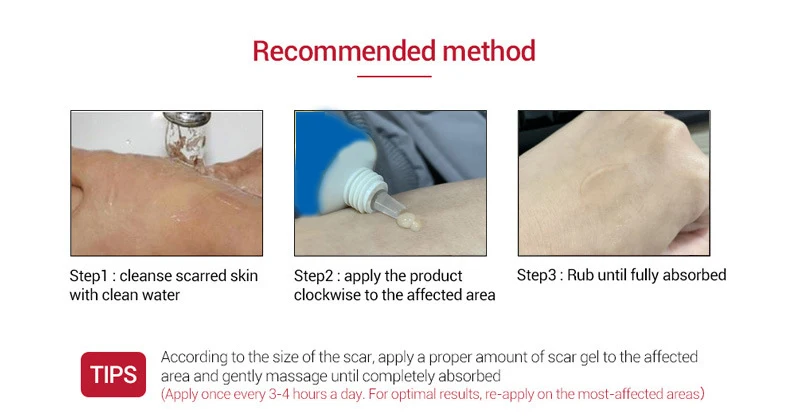 Советы:В соответствии с размером шрамов нанесите правильное количество шрамового геля на пораженный участок и аккуратно массируйте до полного впитывания
