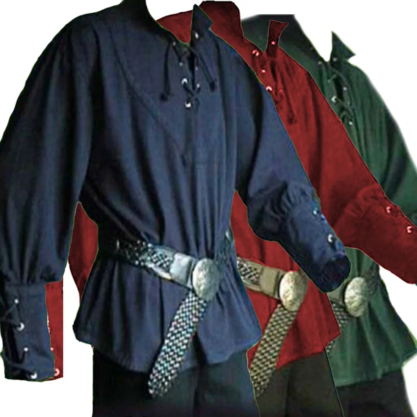 Винтажная Мужская футболка эпохи Возрождения, воротник-стойка, бандаж, длинные рукава, свободная Мужская рубашка средневековья в стиле стимпанк для вечеринки, косплей-костюм