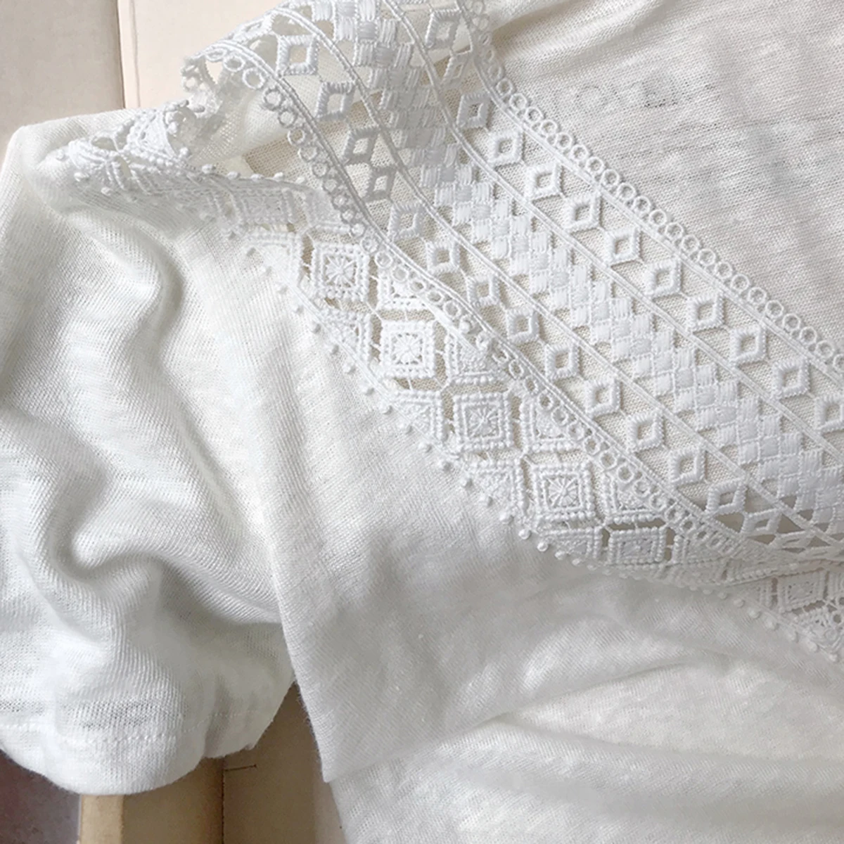 Кружевная ажурная футболка, женская летняя льняная шикарная Элегантная футболка с коротким рукавом, женская одежда, винтажные топы, футболка 2022