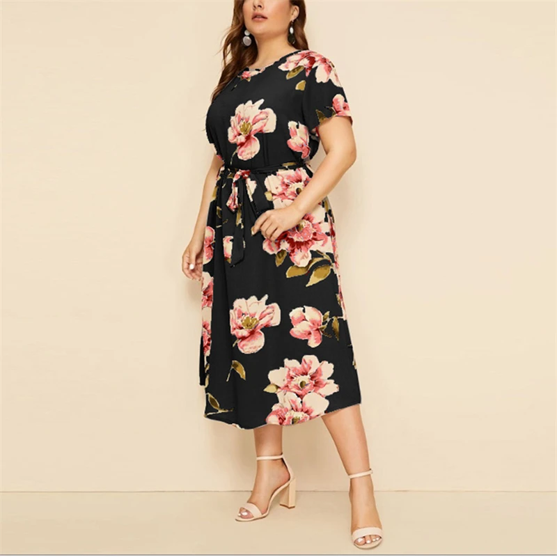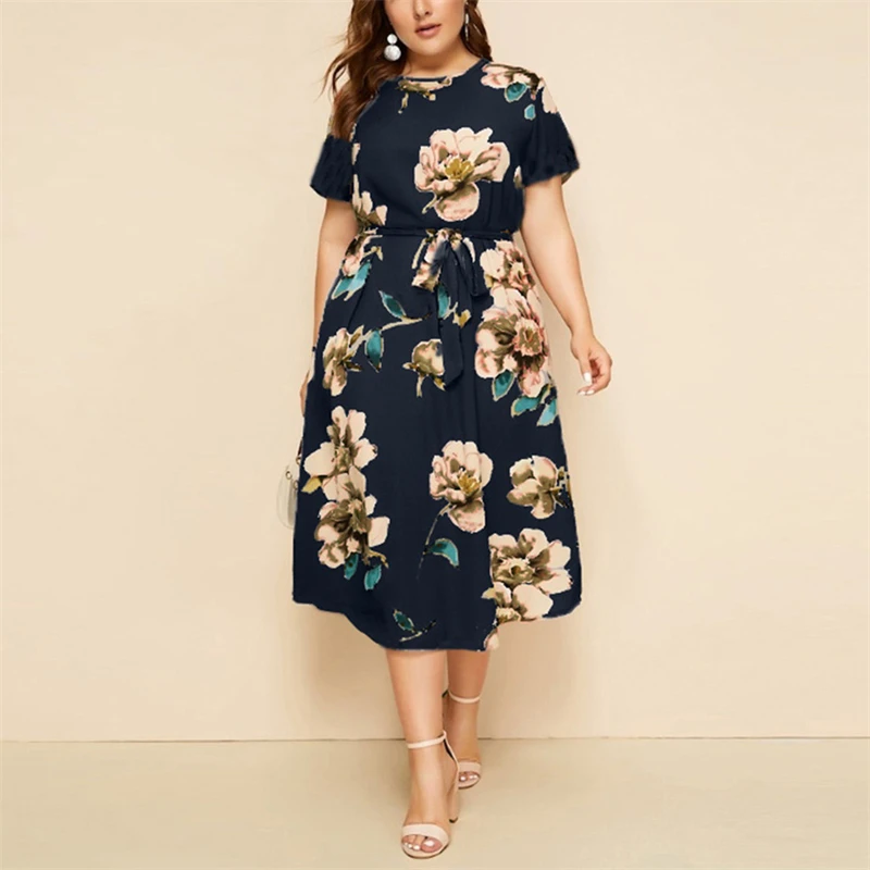 Женское шифоновое платье с цветочным принтом, круглым вырезом и коротким рукавом
