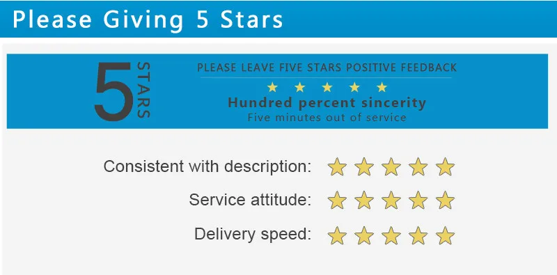 (1) мы оставим положительные отзывы после получения оплаты. Если вы не удовлетворены товаром или обслуживанием после его получения, пожалуйста, свяжитесь с нами и не оставляйте нам негативные или нестандартные отзывы, мы должны предоставить вам удовлетворительное решение.