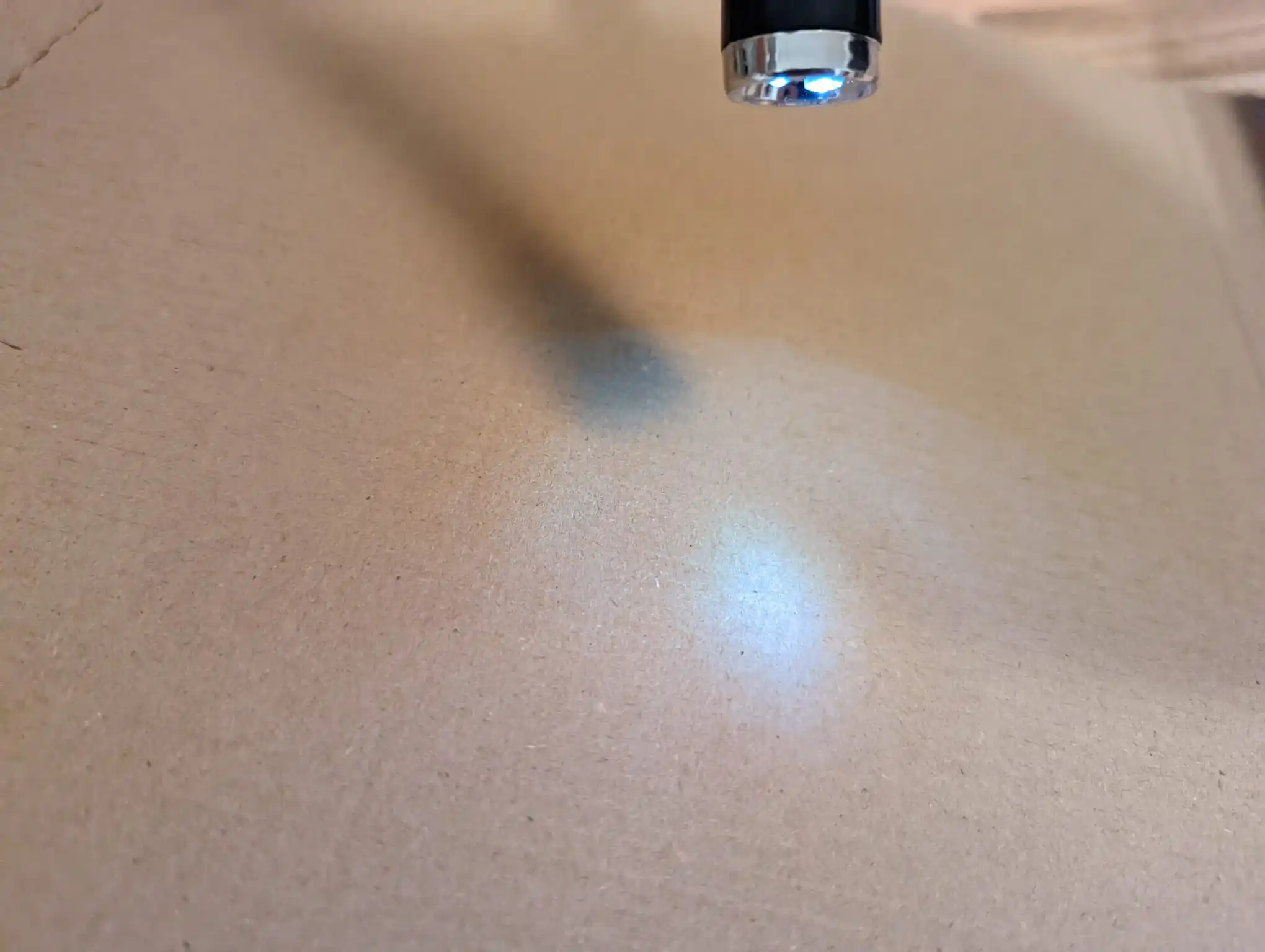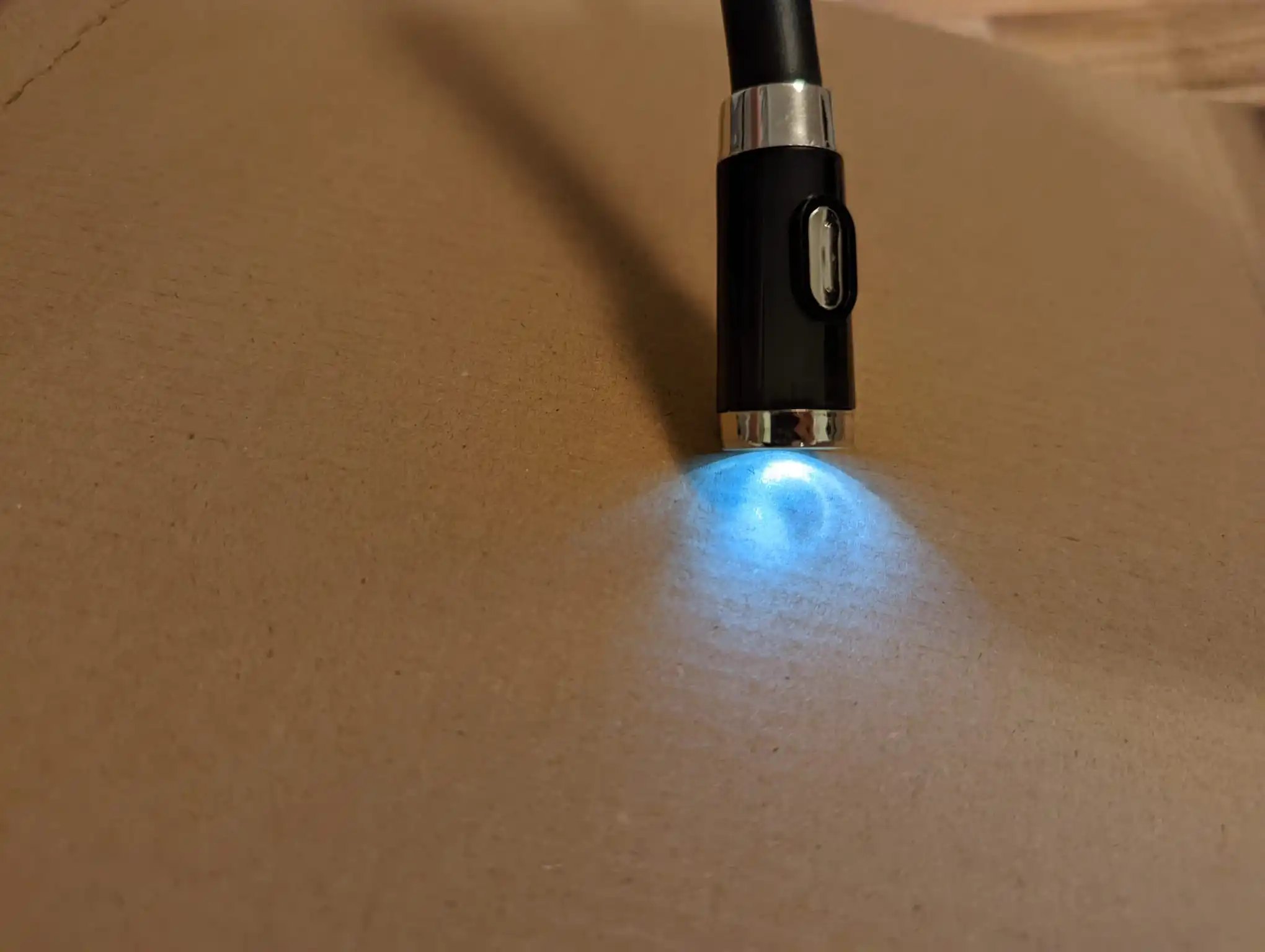 The light is too faint, you can barely see that it is on. Not useful for crocheting or knitting. Here are two pictures in the strongest setting (both leds on). One is right close to the cardboard, and another 3 fingers (~5cm) away.