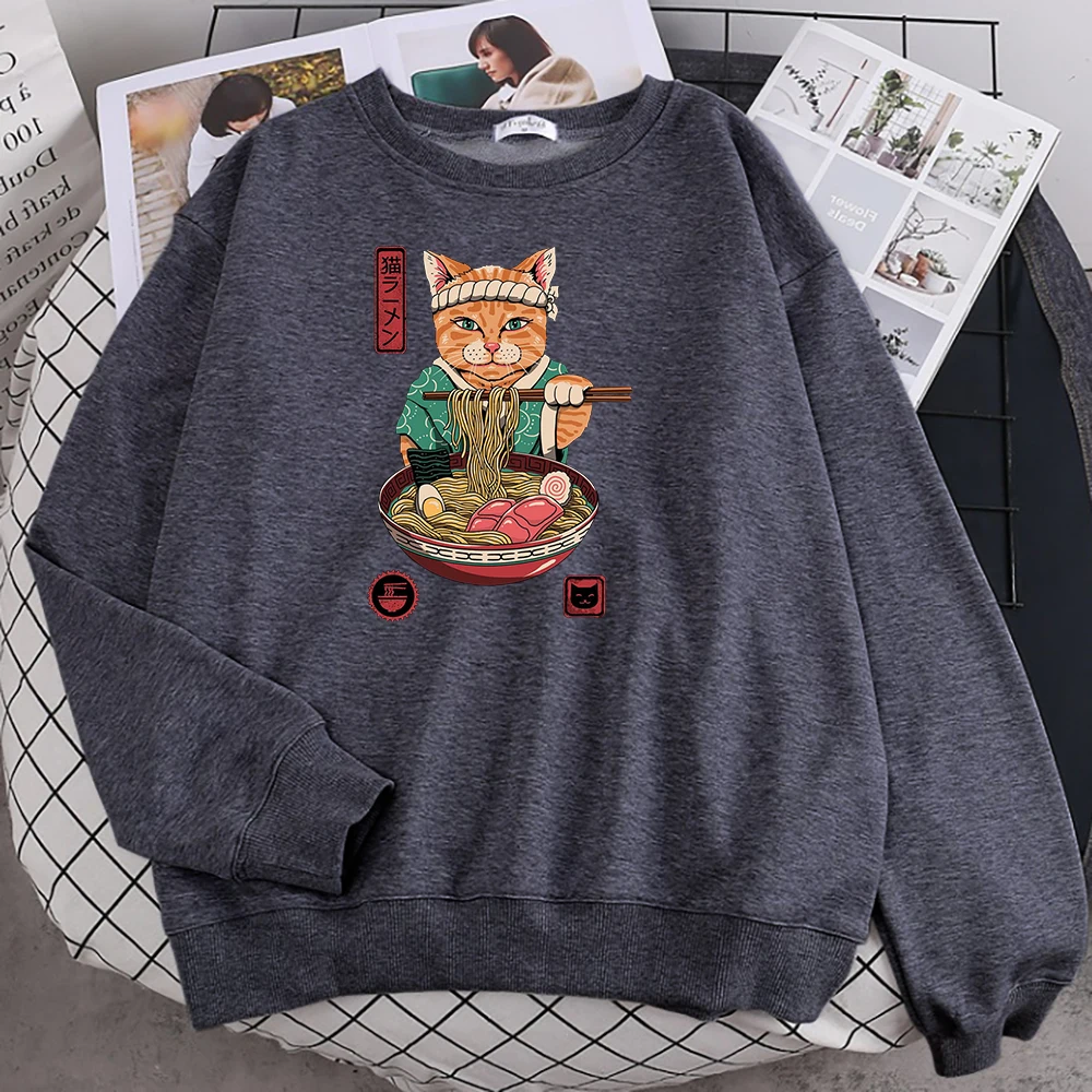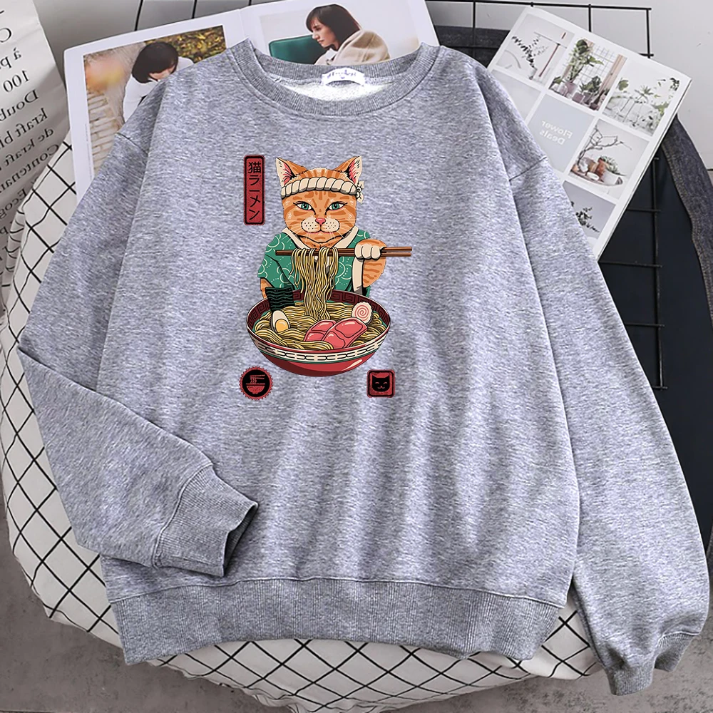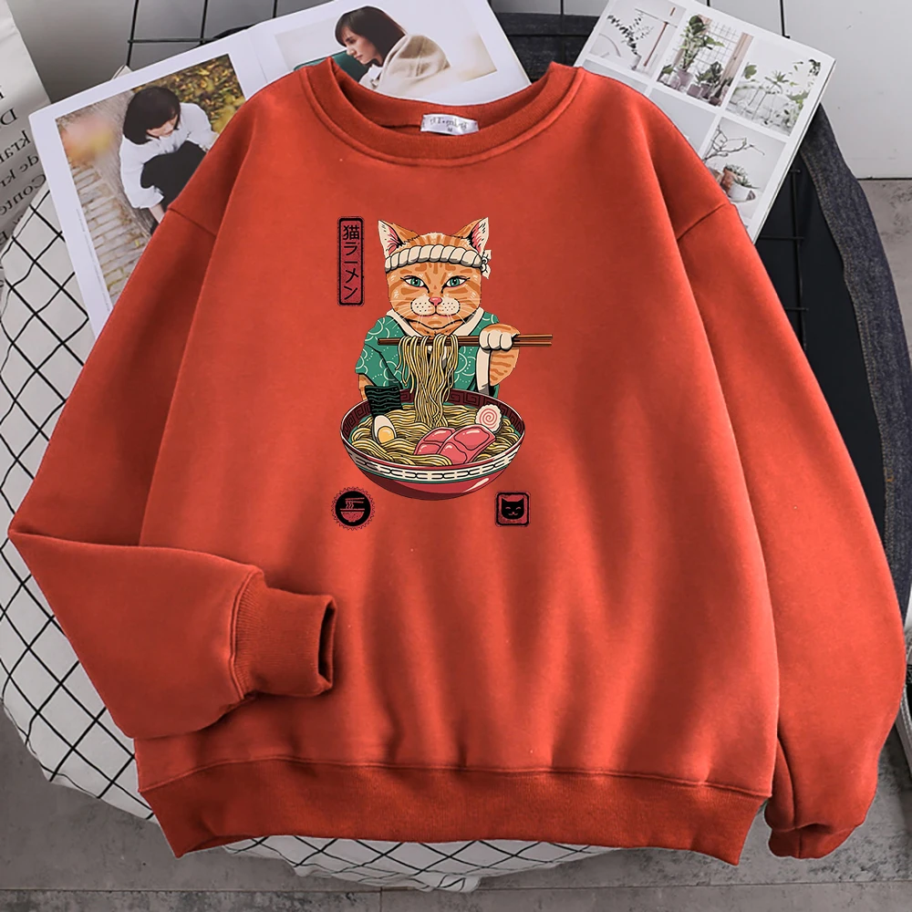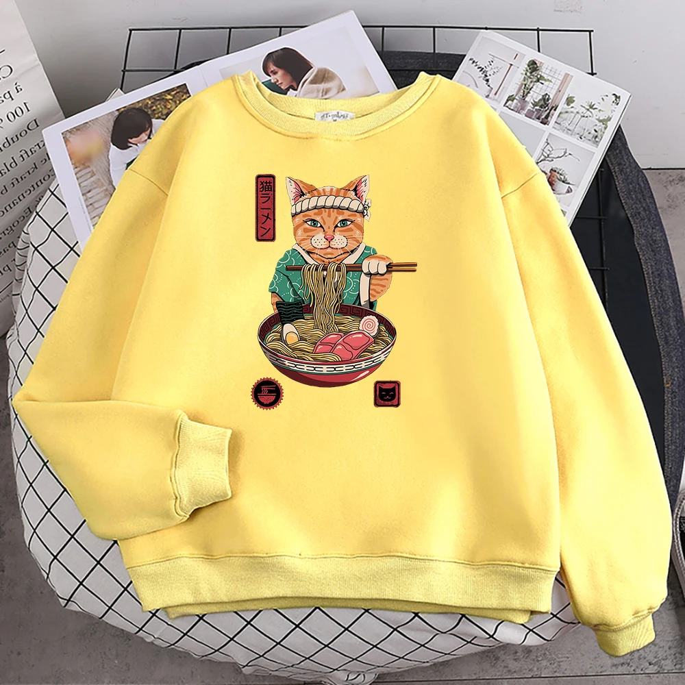 Женская осенняя толстовка с капюшоном в стиле Ukiyo E с принтом кошки и лапши, модная повседневная одежда, винтажные мягкие свитшоты, женские