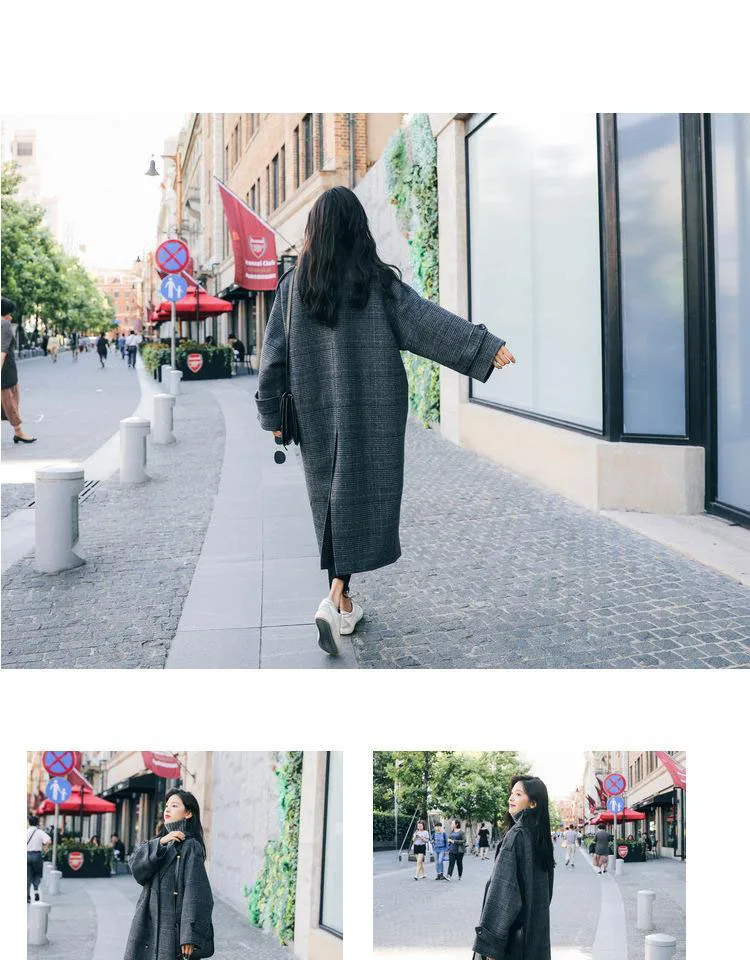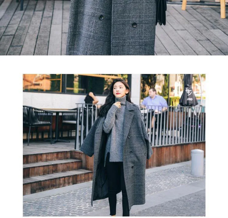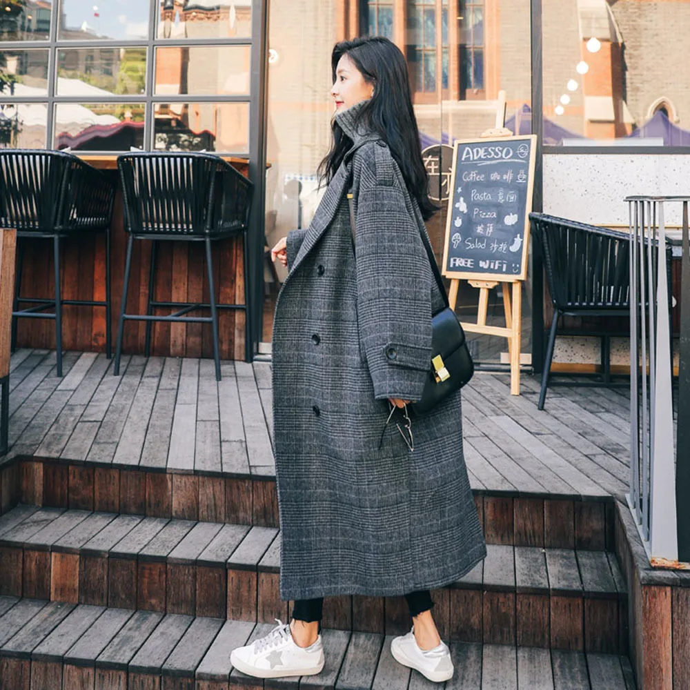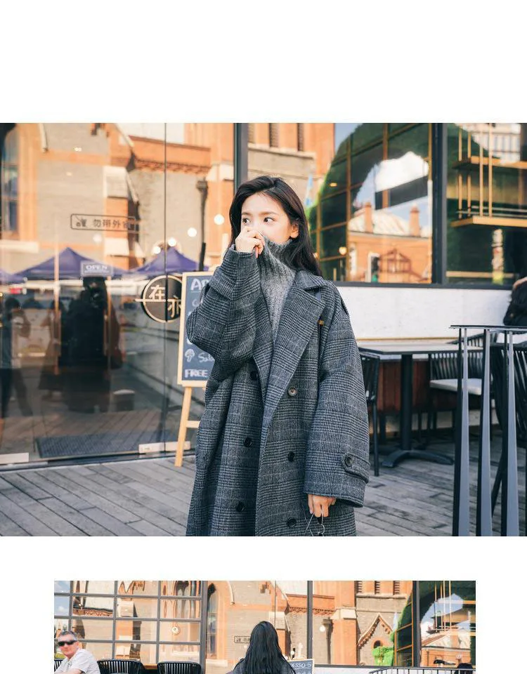Женское шерстяное пальто в клетку, длинное двубортное пальто в Корейском стиле, зимняя одежда больших размеров