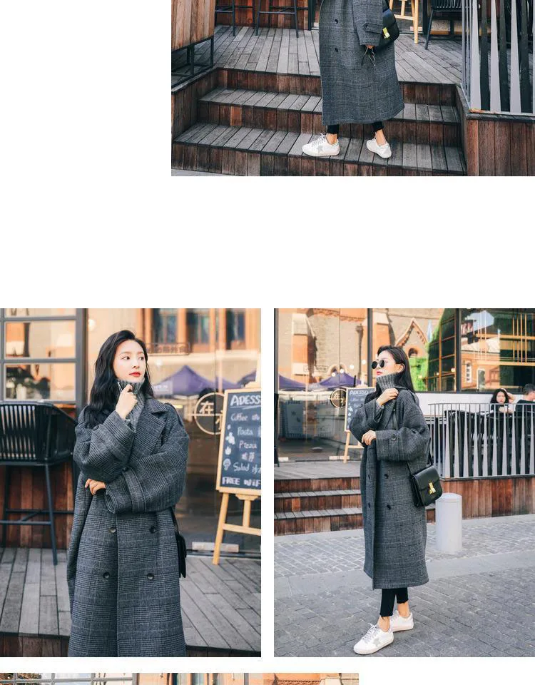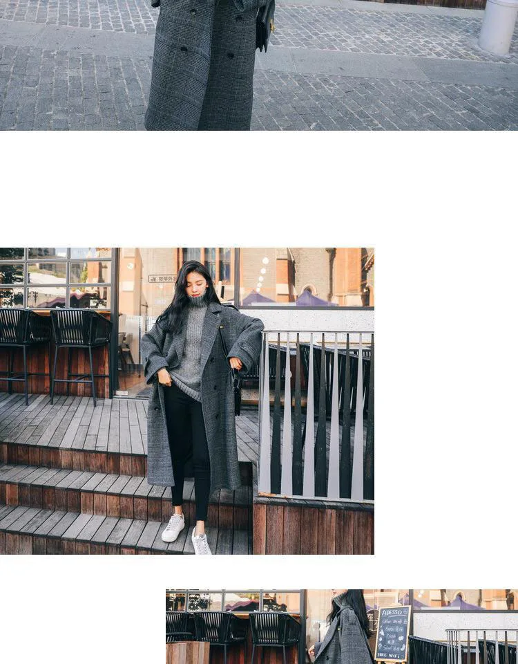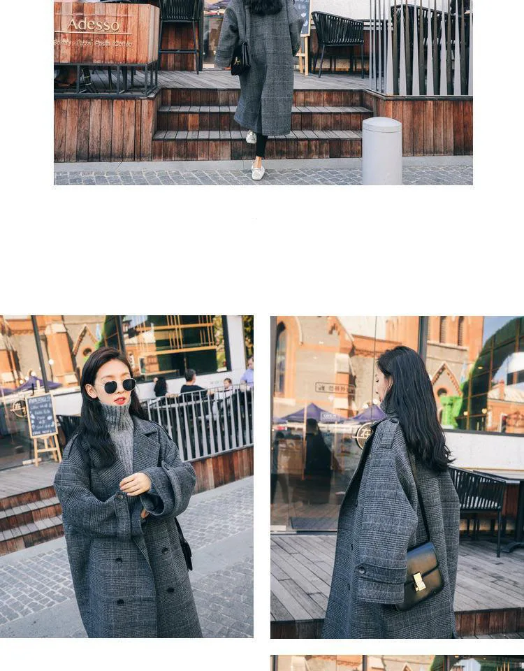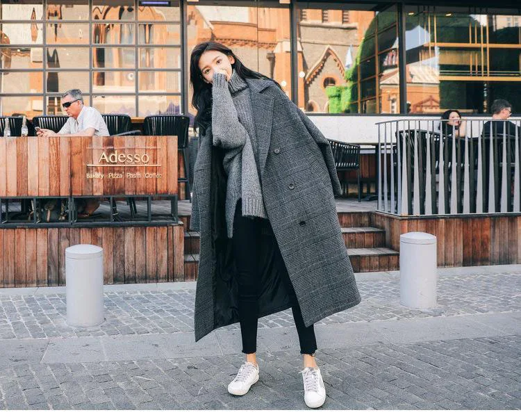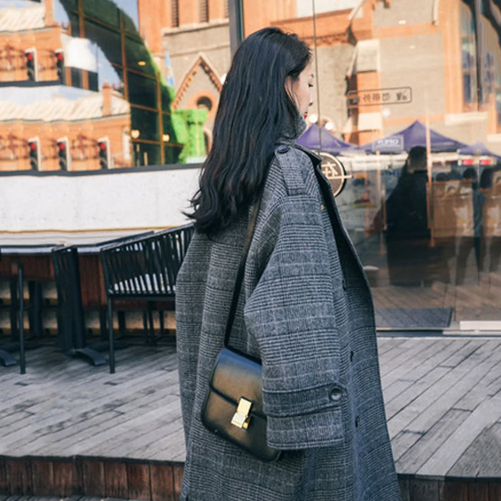 Женское шерстяное пальто в клетку, длинное двубортное пальто в Корейском стиле, зимняя одежда больших размеров
