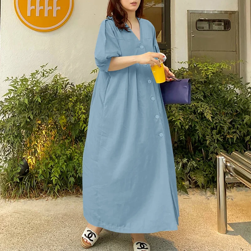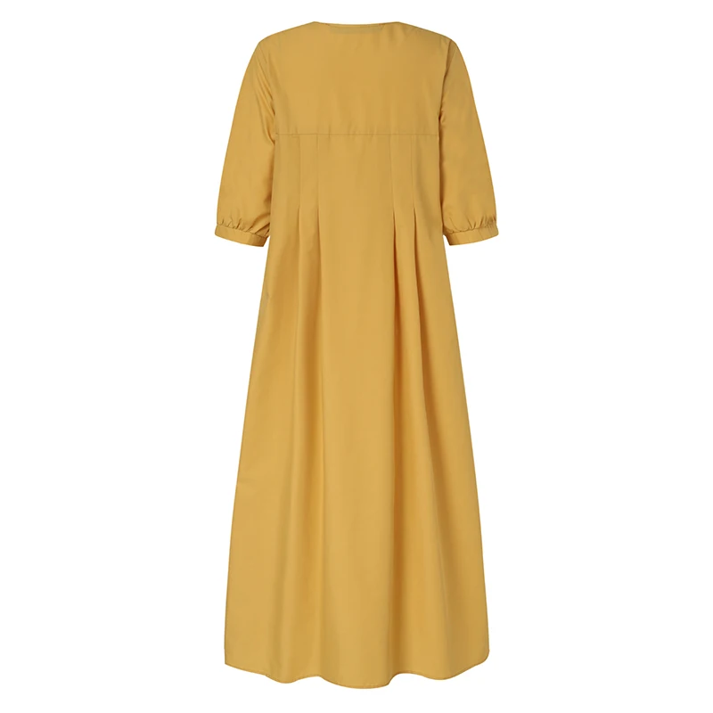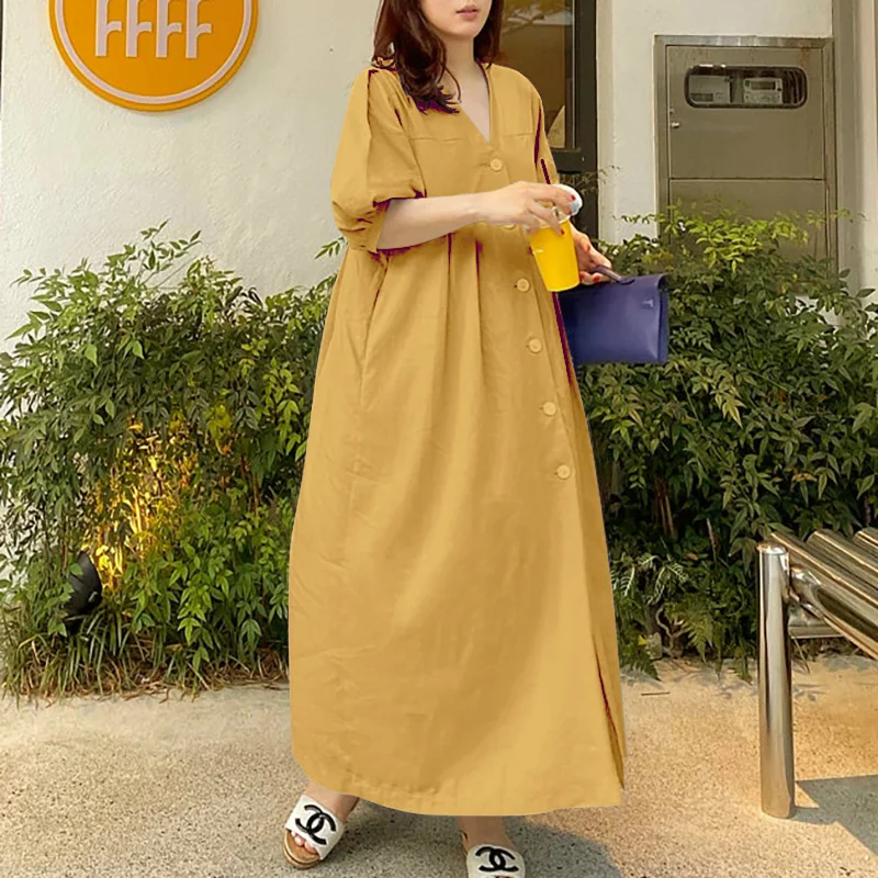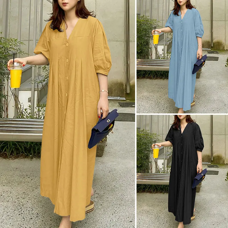 Посылка включает в себя: 1 платьеМатериал: 80% полиэстер + 20% хлопокЦвета: черный, желтый, синий светильникРазмер: S,M,L,XL,2XL,Длина рукава: Половина рукаваВырез: v-образный вырезРисунок: однотонныйДлина: до щиколоткиЦепочка с пряжкой: на пуговицах спередиТолщина: тонкаяСтиль: свободный, богемный, ретро, ЕвропейскийСезон: весна, лето, осеньПовод: Семейные, вечерние, свадебные, праздничные