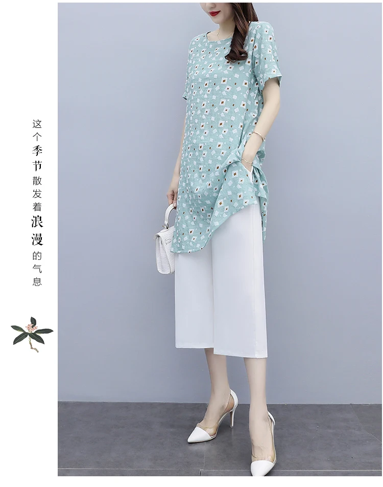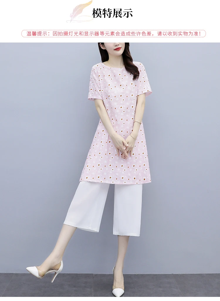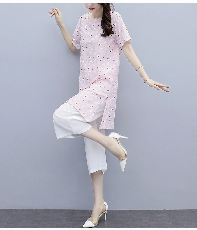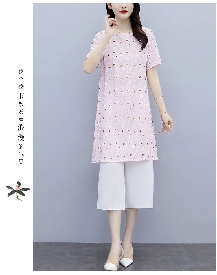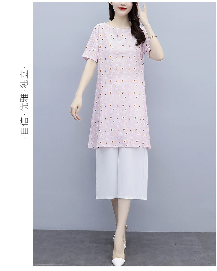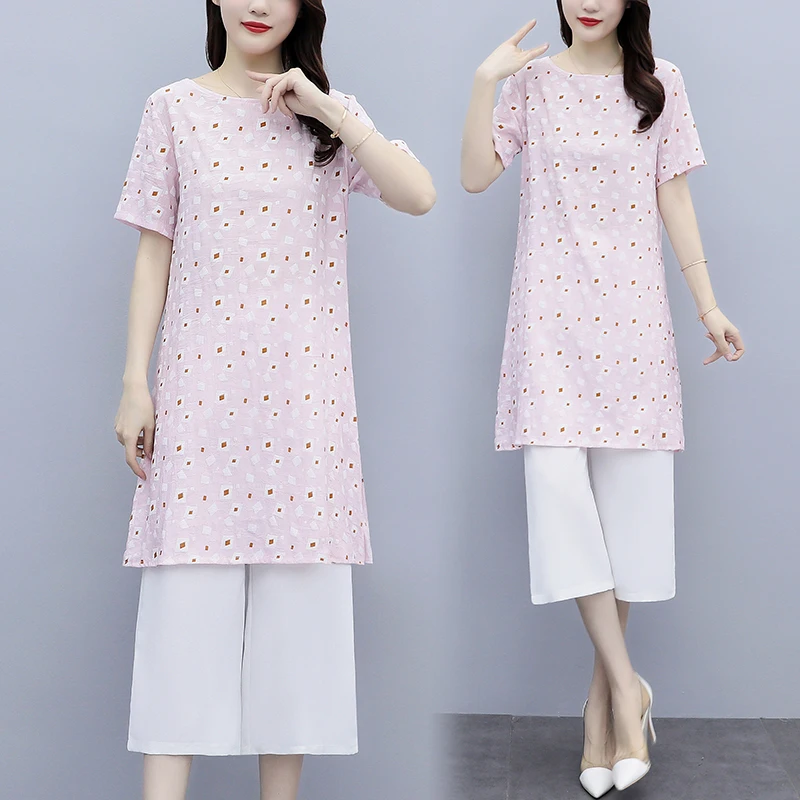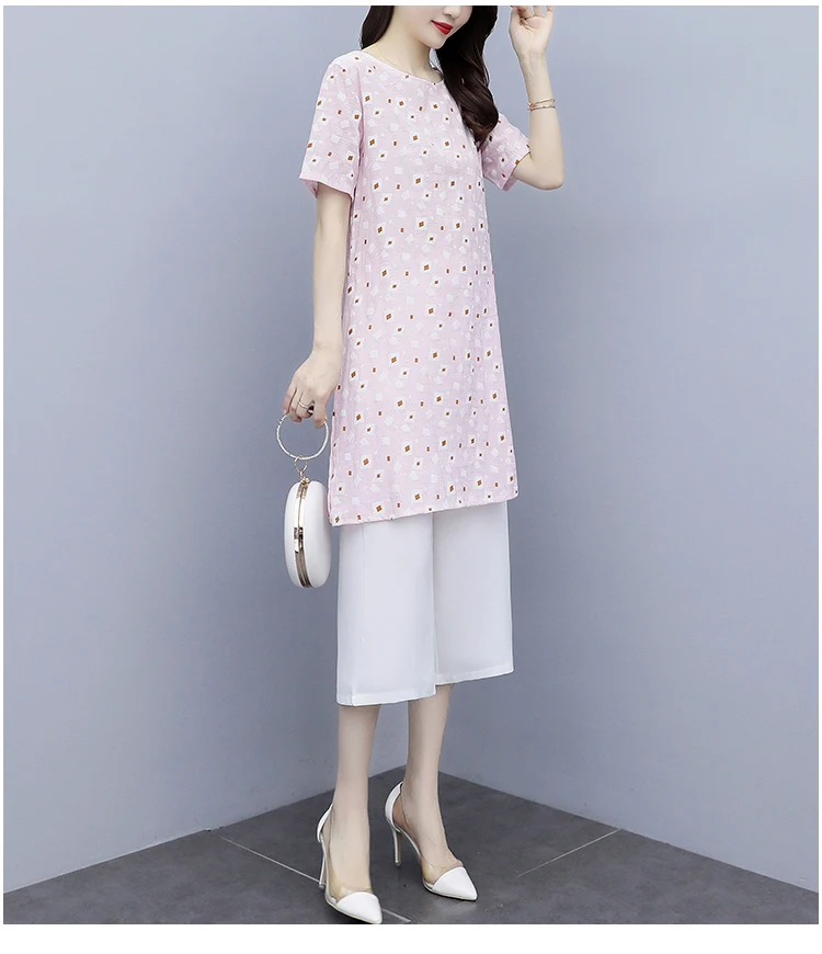 Костюм спортивный женский из хлопка и льна, розовый, с принтом, Длинный топ + широкие брюки, размера плюс
