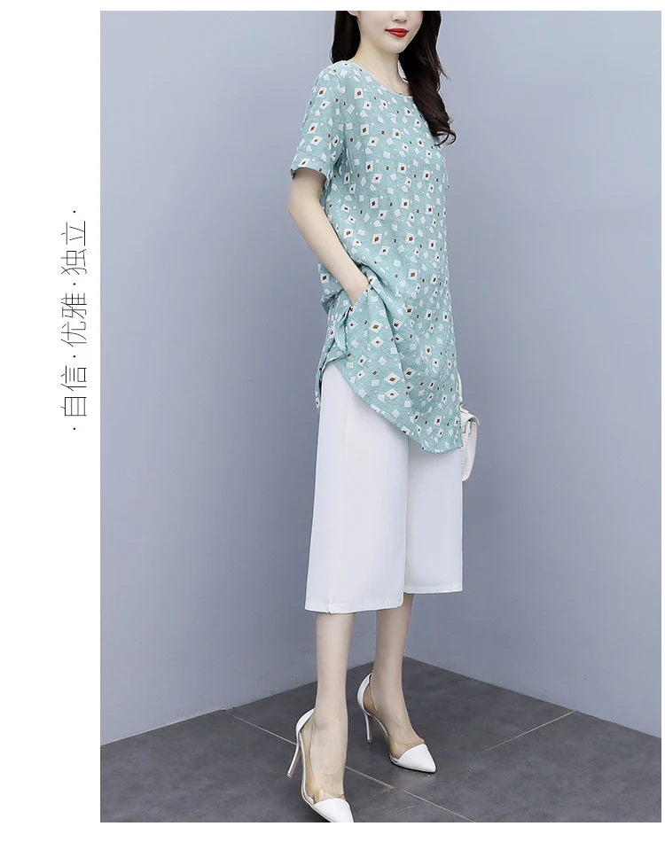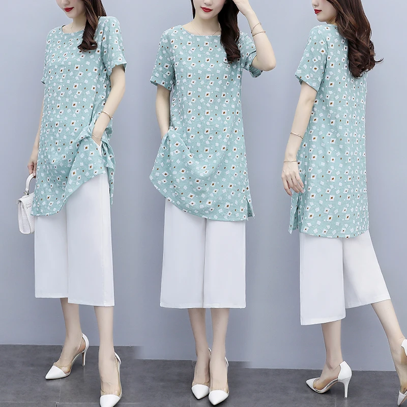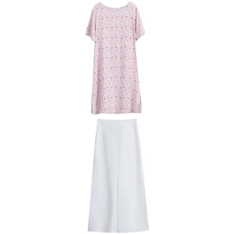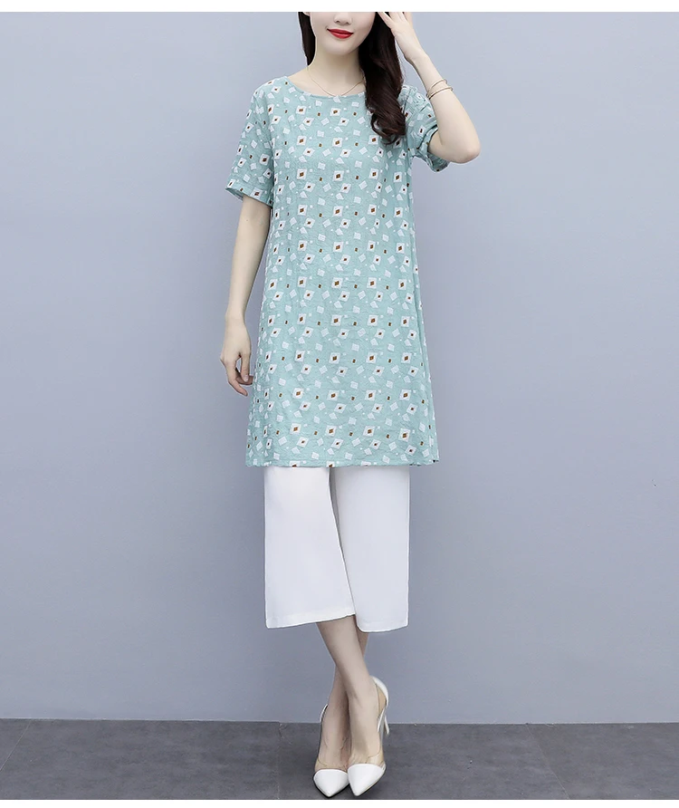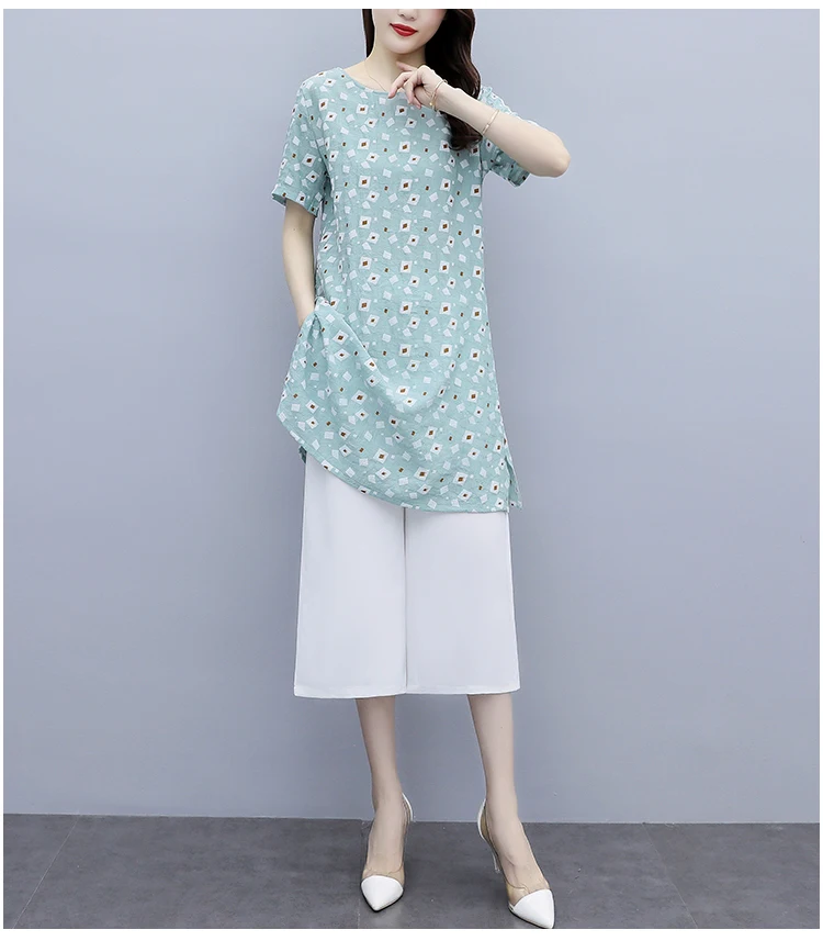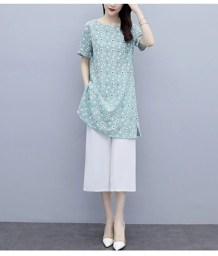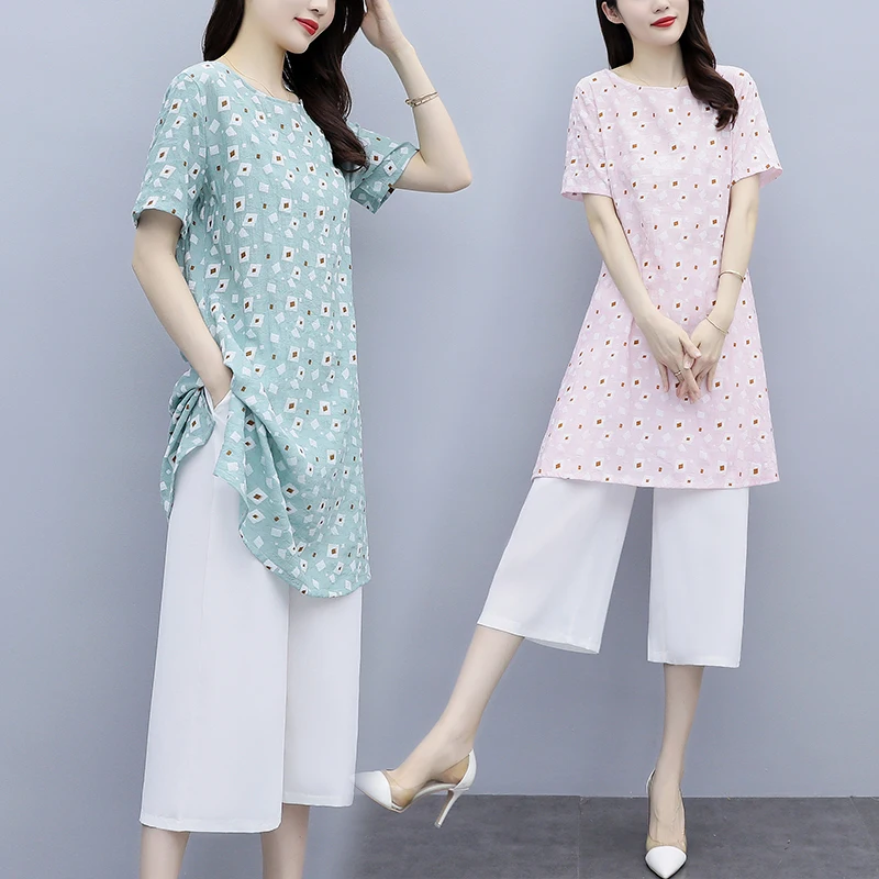 Костюм спортивный женский из хлопка и льна, розовый, с принтом, Длинный топ + широкие брюки, размера плюс