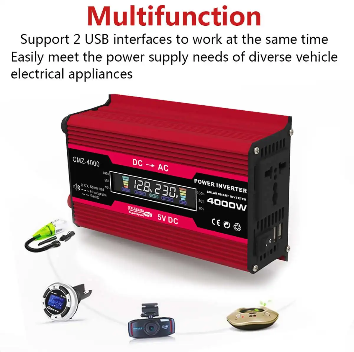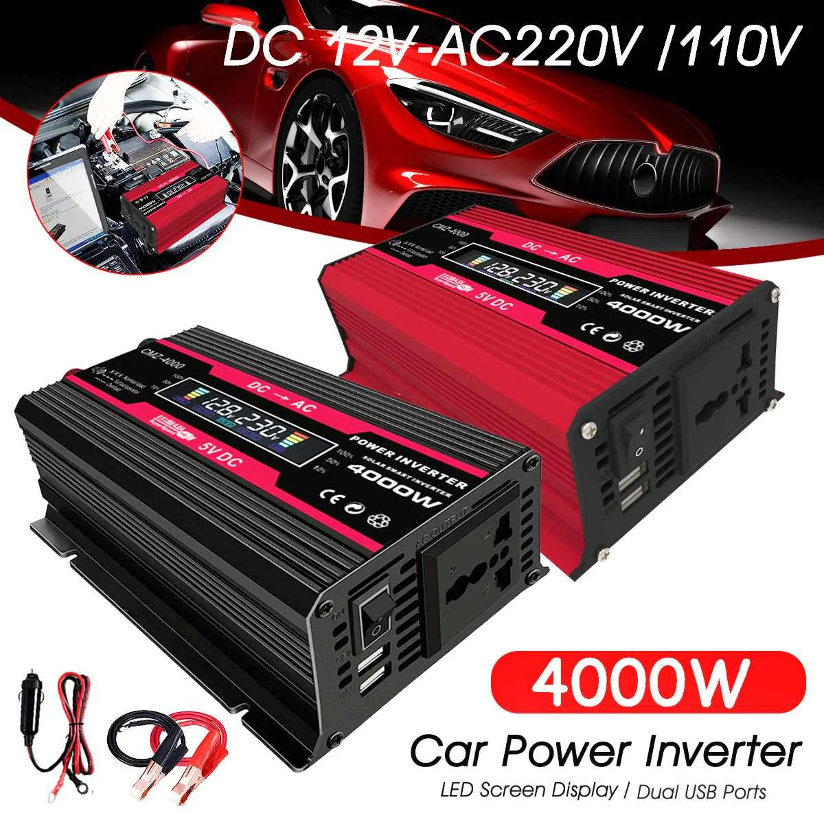Посылка включает в себя:1x инвертор питания2x батарейный зажим1x разъем прикуривателя (подарок)1x руководство на английском языкеХарактеристики:Название: автомобильный инверторМодель: CMZ-4000Цвет: черный/красный (на ваш выбор)Выходное напряжение: 110 В/220 В переменного тока (на ваш выбор)Вход напряжение: DC 10,5 V ~ 15В,(В тех случаях, когда напряжение батареи ниже, чем 10,5 V инвертор-это защита от низкого напряжения, когда напряжение батареи если сумма вашего заказа превышает 15V, инвертор высокого напряжения Защита)Выходное напряжение: 110 В переменного тока/220 В на ваш выборВыходная частота: 50 Гц для модели 220 В/60 Гц для модели 110 В.Пиковая мощность: 4000 ВтНоминальная мощность: 300 ВтФорма выходного сигнала: модифицированная Синусоидальная волнаРазмер изделия: 20x11.2x5.6 смРазмер посылка: 7,87x4,4x2,2 дюймовВес: 0,65 кгAdavantage:1.[автомобильный инвертор] Автомобильный инвертор с 2 usb-портами и одним выходом переменного тока. Инвертор питания поставляется с бесплатной прикуривателем и 2 зажимами для батарей, Обеспечивая непрерывную мощность 300 Вт, максимальная мощность 4000 Вт (убедитесь, что общая номинальная мощность подключенных устройств ≤ 300 Вт). Кабель прикуривателя может легко поставить питание для устройства. Если выходная мощность выше 150 Вт, пожалуйста, используйте зажимы типа «крокодил» для аккумулятора.2.[Светодиодный зеленый и красный рабочие Огни] Когда инвертор работает нормально, зеленый светодиодный свет работает и говорит вам, что он работает хорошо, но когда он находится на состоянии защиты, например, низкое напряжение, высокое напряжение, перегрев или перегрузка, Красный светодиодный светильник s будет светильник и вам нужно, чтобы выключить инвертор, и проверить, какие функции защиты работает, и попытаться решить его, а затем инвертор может работать снова.3.[Интеллектуальный ЖК-дисплей напряжения] Цветной смарт-ЖК-дисплей показывает входное напряжение батареи, выходное напряжение, емкость батареи, частоту 50 Гц или 60 Гц, грузоподъемность в режиме реального времени, который может помочь вам узнать состояние инвертора удобно.4.[Быстрая зарядка с двумя портами USB] одна розетка переменного тока и два порта зарядного устройства usb (макс. 4,2a) для одновременной работы, и он может предложить 100% быструю зарядку для мобильных телефонов, компьютеров, ноутбуков, молокоотсос, распылитель, бритва, медицинское спасательное устройство, Аварийное оборудование и т. д. легко удовлетворить потребности источника питания различных транспортных средств электроприборов и может быть в качестве аварийного источника питания.5.[Мульти Защита] Встроенный предохранитель, безопасная конструкция зарядки и охлаждающий вентилятор предотвращает автомобильный преобразователь питания от перегрева, экономии энергии и энергии, перенапряжения, перегрузки, перегрузки по току, короткое замыкание, понижение напряжения, перегрев, защита от короткого замыкания.6.[легкий дизайн и высокое качество] Легкий и компактный, идеально подходит для отдыха, кемпинга и рабочих поездок. Его можно подключить практически к любому выходному транспортному средству питания 12 В, обеспечивая возможность зарядки в любом месте.Применение:-Применимые нагрузки для номинальной мощности до 300 Вт:5w-сотовый телефон5w-молокоотсос10w-цифровая электроника (Ipad/Автомобильная Навигация/Цифровая камера)10w-игро