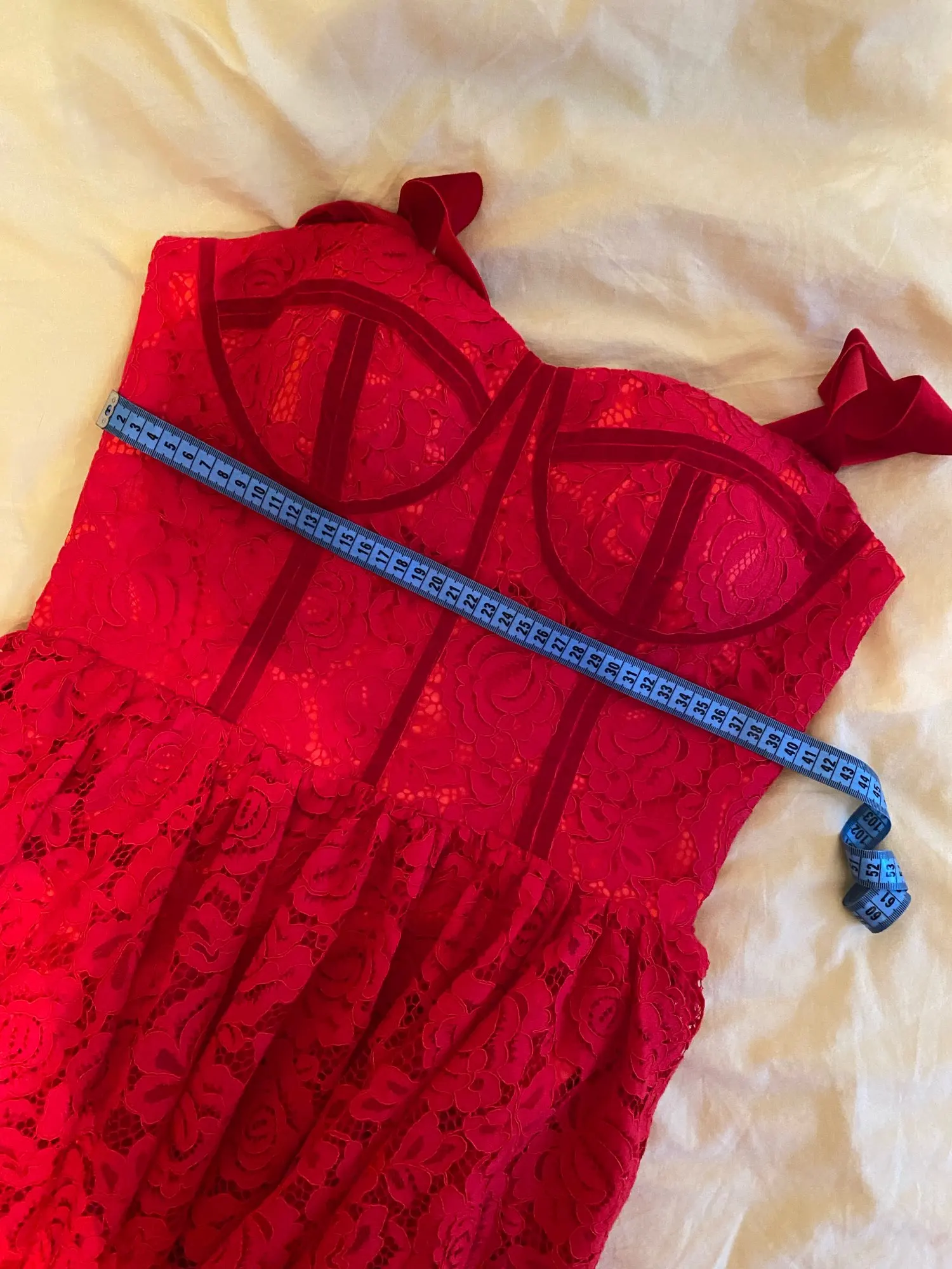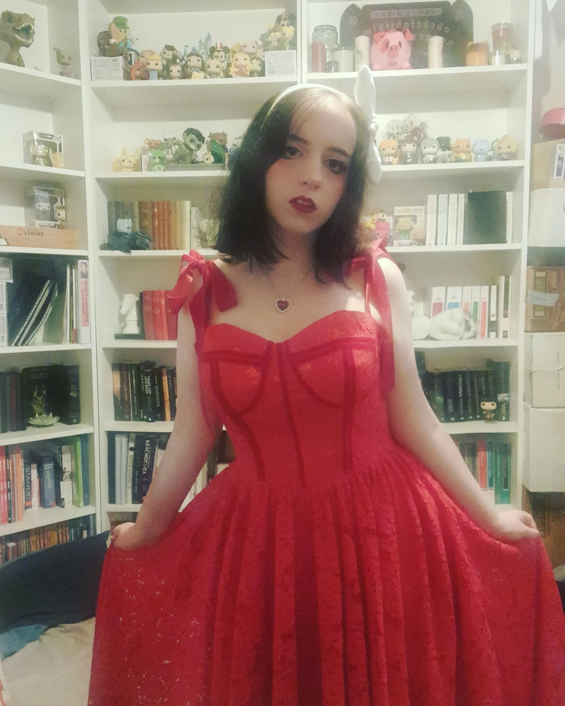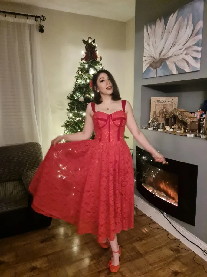 Красивое платье, я бы мог немного понизить размер, единственная жалоба, которую я могу сделать, это чашки довольно большие на мне, и их нужно будет взять, так как там довольно немного пространства. Мне все еще очень понравилось мое новое рождественское платье. Есть карманы! Очень беспокоился, что кружево будет на более дешевой стороне, но это красивое толстое кружево. Большое спасибо за то, что прислали его мне до Рождества.