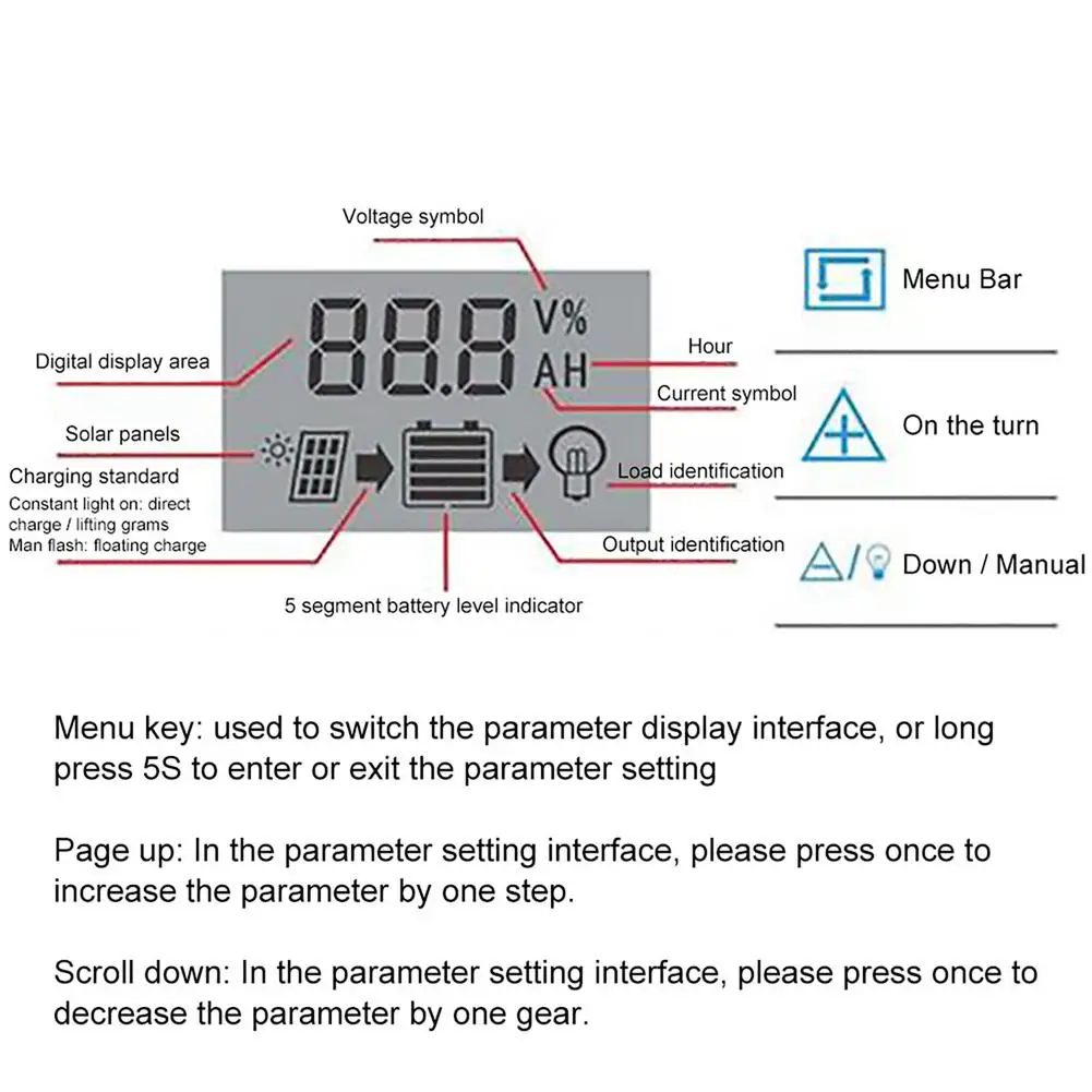 1. Усовершенствованная технология отслеживания максимальной мощности (PWM), эффективность не менее 99.5%. Высококачественные компоненты улучшают производительность системы, а максимальная эффективность преобразования составляет 98%. Супер быстрая скорость отслеживания и гарантированная эффективность отслеживания.2. Большой ЖК-дисплей, дисплей заряда и разрядки, кумулятивный запрос электроэнергии и разрядки, дисплей температуры, светильник управления + контроль задержки; Регулируемые параметры заряда и разряда, С памятью отключения питания и другими функциями.3. Двойной выход USB, максимальный ток 2.5A, поддерживает мобильный телефон Apple зарядка.Оснащен всеми необходимыми защитными устройствами, параметры управления системы регулируются, легко настраиваются и работают.4. Встроенная защита от короткого замыкания, защита от открытого замыкания, защита от обратного соединения, защита от перегрузки. Защита от обратного тока, низкая теплотворная способность, с функцией самовосстановления, не повредит контроллер.Особенности:1. Отображение температуры в реальном времени, зарядный ток и ток разряда2. Текущий Автофокус PWM отслеживание зарядки, высокая эффективность зарядки, процесс зарядки не останавливает обнаружение, двустороннее отслеживание фокуса.3. Зарядка 12V /24V литиевая батарея, супер широкий заряда и разряда регулируемый4. Минуты регулируются, когда выход выключен, что более удобно (нет регулировки, когда рынок только доступен).5. Встроенный перегрев, перегрузки по току, короткого замыкания, защита от открытого замыкания, устранение неисправностей, автоматическое восстановление контроллера6. Двусторонняя трубка MOS с защитой от обратного потока, режим зарядки высокой мощности, сверхнизкое тепло.7. R5.0 разъем постоянного тока для солнечной зарядки, R5.0 выход лампы постоянного тока, легко подключить.Описание мощности PV системы:30A / 40A / 50A/ 60A /100A аккумуляторные батареи 12V фотоэлектрической системы: мощность составляет соответственно 360W, 480W, 600W, 720W , 840W30A / 40A / 50A / 60A/ 100A батарея 24V фотоэлектрической системы: мощность составляет соответственно 720W, 960W, 1200W,1440W, 1680WСпецификация:Название: Солнечный контроллер с ЖК-экраномНапряжение: 12 В/24 В постоянного токаДисплей: ЖК-экранСамопотребление: <10 мАЗащита от избыточного заряда благодаря: 14,4 V/28,8 VПерезарядка Поплавковый заряд: 13,7 в/27,4 ВВосстановления заряда напряжение: 12,6 V/25,2 VЗащита от перегрузки: 10,7 В/21,4 вПо сравнению с восстановление сброса: 12,6 V/25,2 VДвойной выход USB: 5 В/2 А (зарядка мобильный телефон, iPad и т. д.)Рабочая температура: -35 ℃ -60 ℃12V подходит 18V панели солнечных батарей, 24V подходит для е-байка 36В панели солнечных батарей12,0 вольт свинцово-кислотная батарея соответствующаяНапряжение поплавка устанавливается на: 13,6Восстановительное напряжение разряда устанавливается на: 12,6Напряжение отключения разряда устанавливается на: 10,712,8 вольт литиевая железная фосфатная батарея, соответствующаяНапряжение поплавка устанавливается на: 14,6Восстановительное напряжение разряда устанавливается на: 13,6Напряжение отключения разряда устанавливается на: 11,011,1 вольт литиевая батарея соответствующаяНапряжение поплавка устанавливается на: 12,6Восстановления разрядное напряжение установлен: 11,6В критическое разрядное напряжение устанавливается: 9,6Функция:1. Всегда держите батарею на заполненном состо