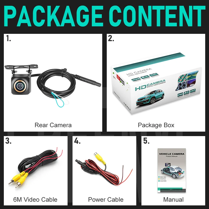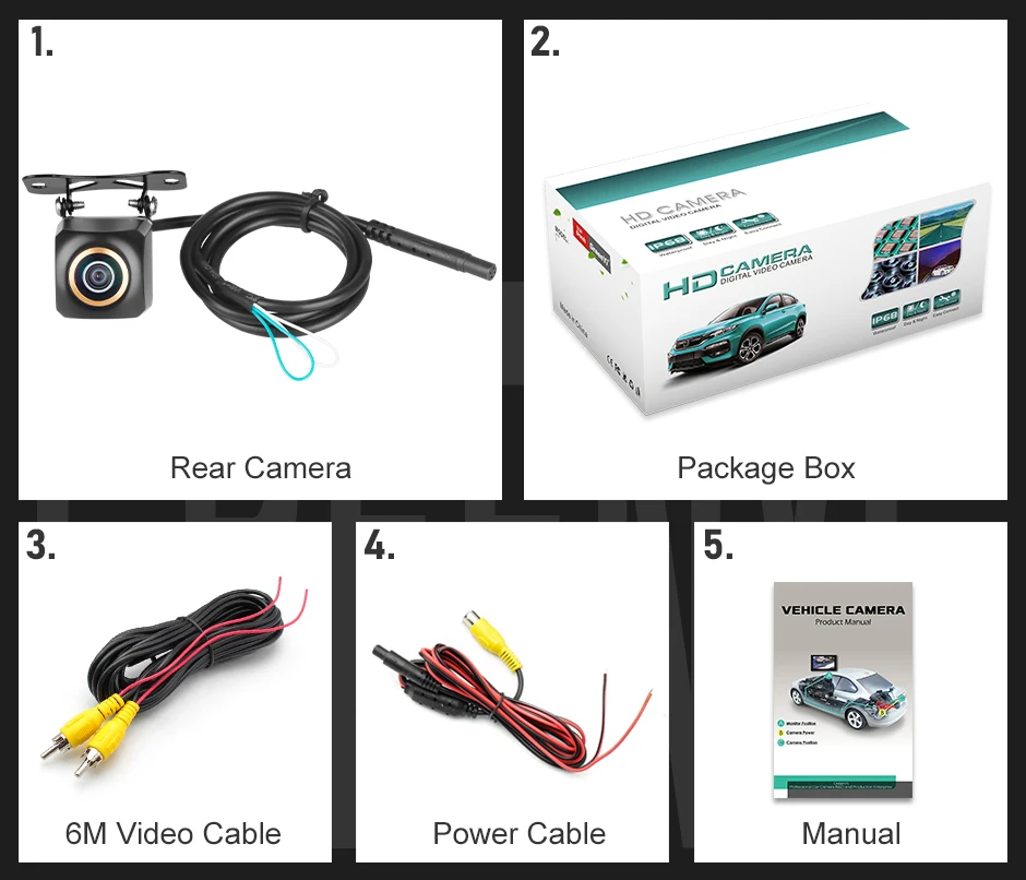1. Фронтальная/камера заднего вида2. Self-винт стук3. Видео кабель 6 м4. 1,5 м Мощность кабель5. Руководство пользователя