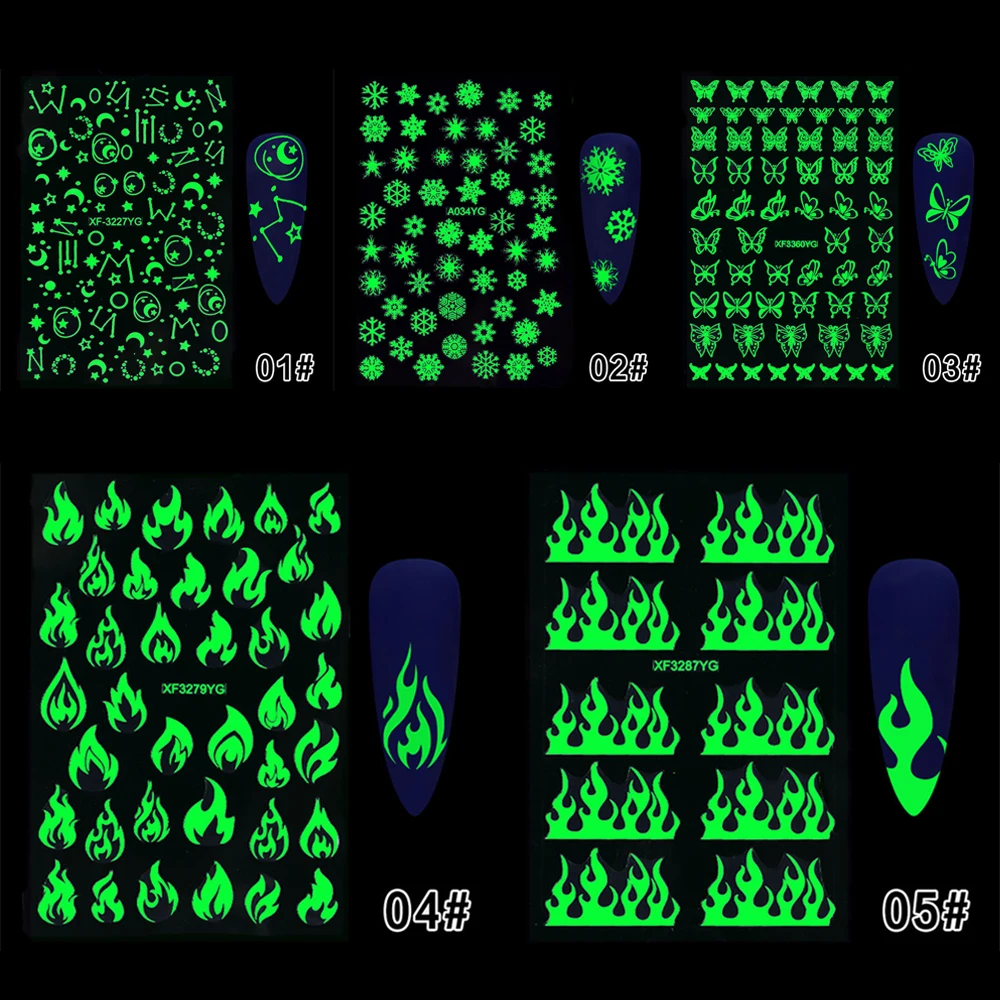 Светящиеся наклейки для дизайна ногтей в виде пламени, бабочки, сне...