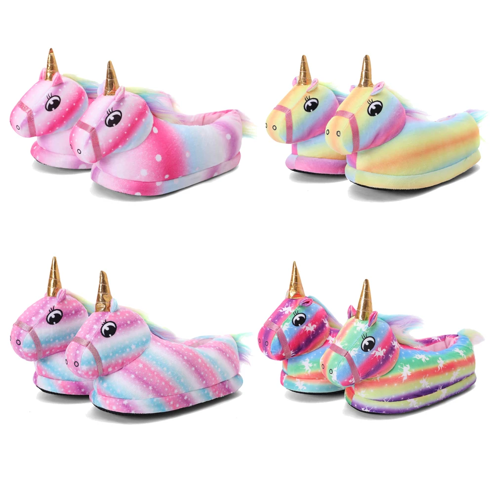 Пижамная обувь с единорогом для детей, зимняя теплая фланелевая обувь для мальчиков и девочек со звездами и радугой, домашняя обувь для взрослых и женщин, обувь с орнаментом