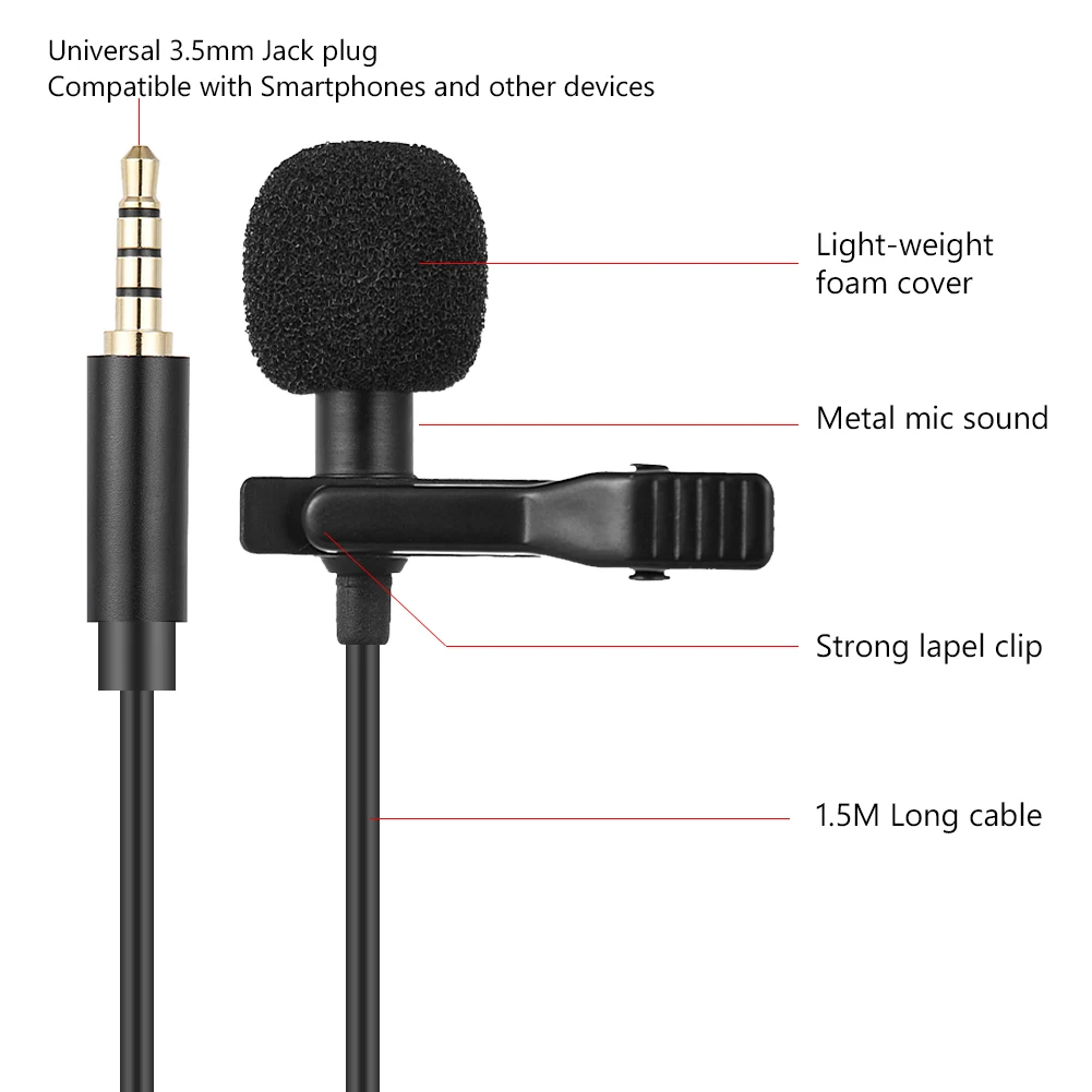 Портативный петличный мини-микрофон 1,5 м, конденсаторный проводной микрофон с креплением на лацкане и разъемом 3,5 мм, микрофон для телефона, ноутбука, ПК