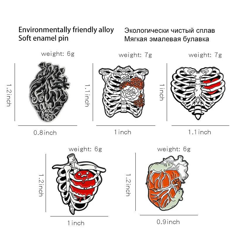 Эмалированные заколки в форме сердца и скелета, анатомические броши...