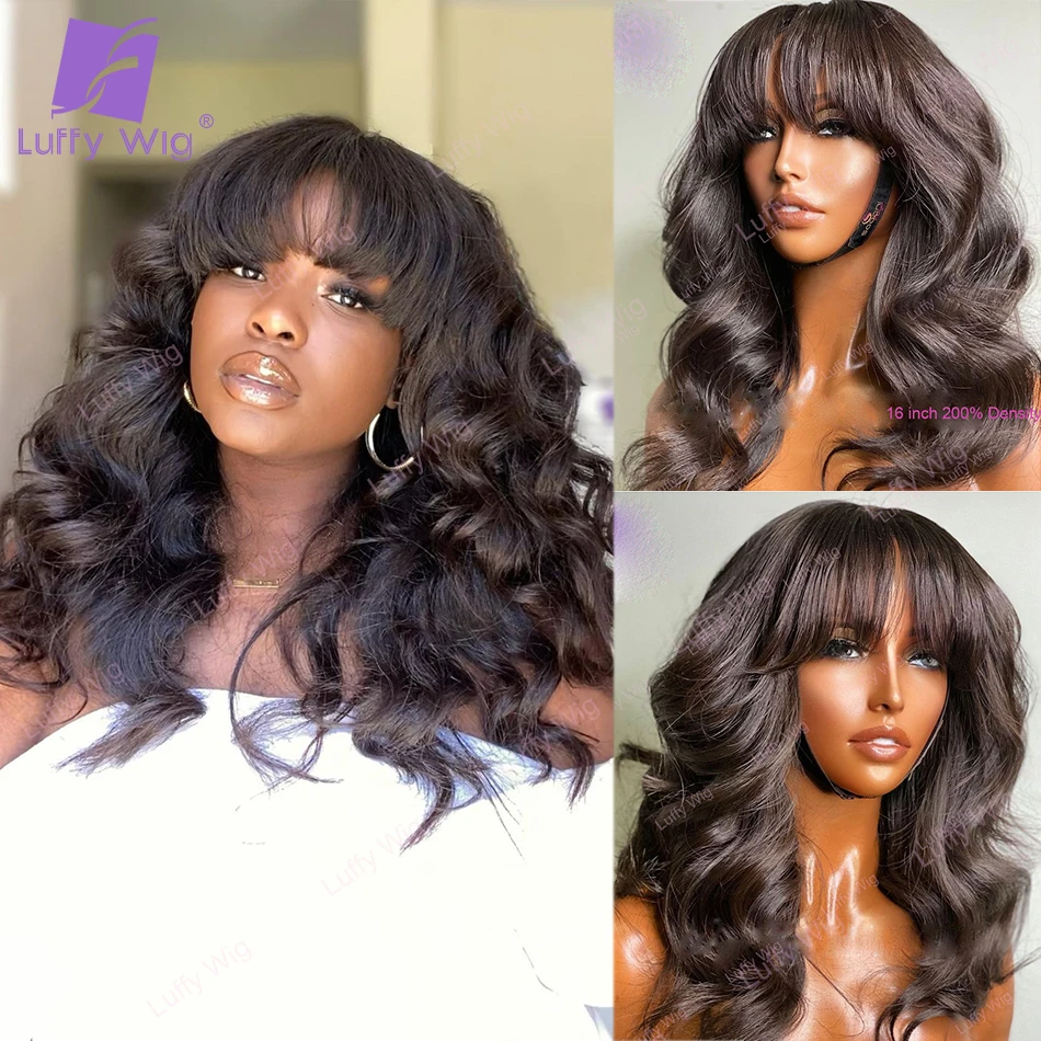 Парики из натуральных волос, плотность 200, волнистые, с челкой, бразильские волосы Реми, без клея, для чернокожих женщин