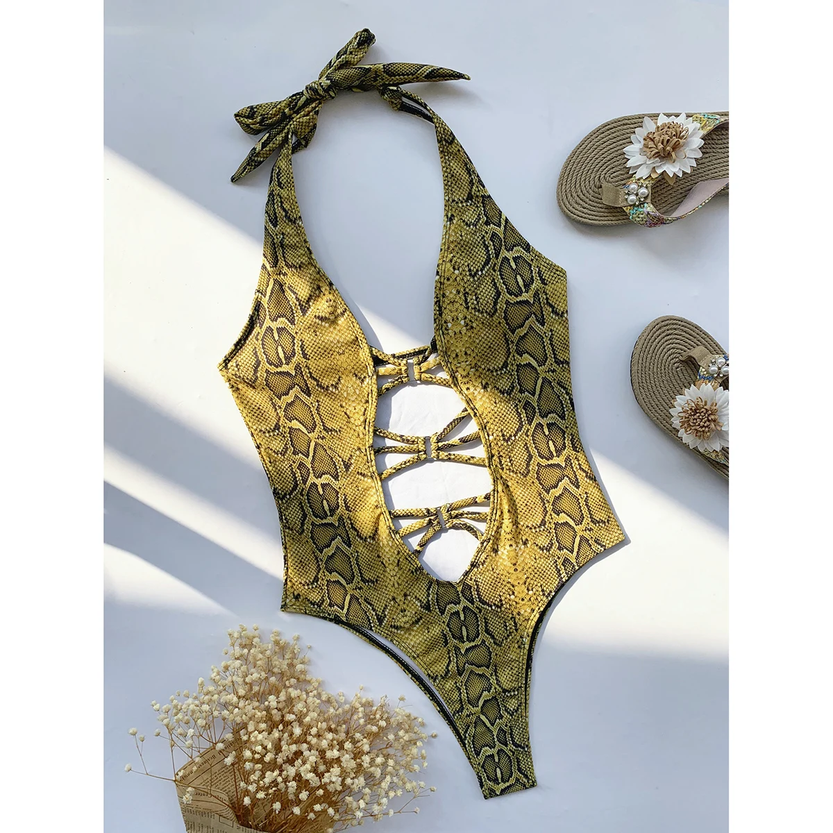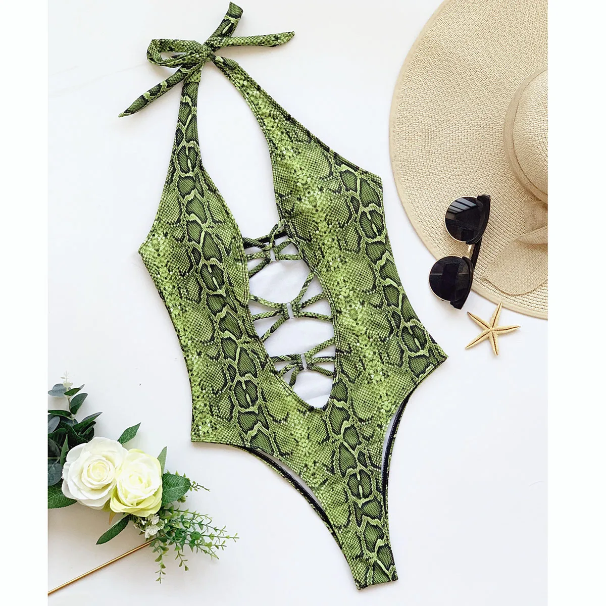 2021 сексуальный женский цельный купальник, женский купальник с лямкой на шее, перекрестные стринги, змеиная кожа, купальный костюм, монокини с высокой талией, пляжная одежда