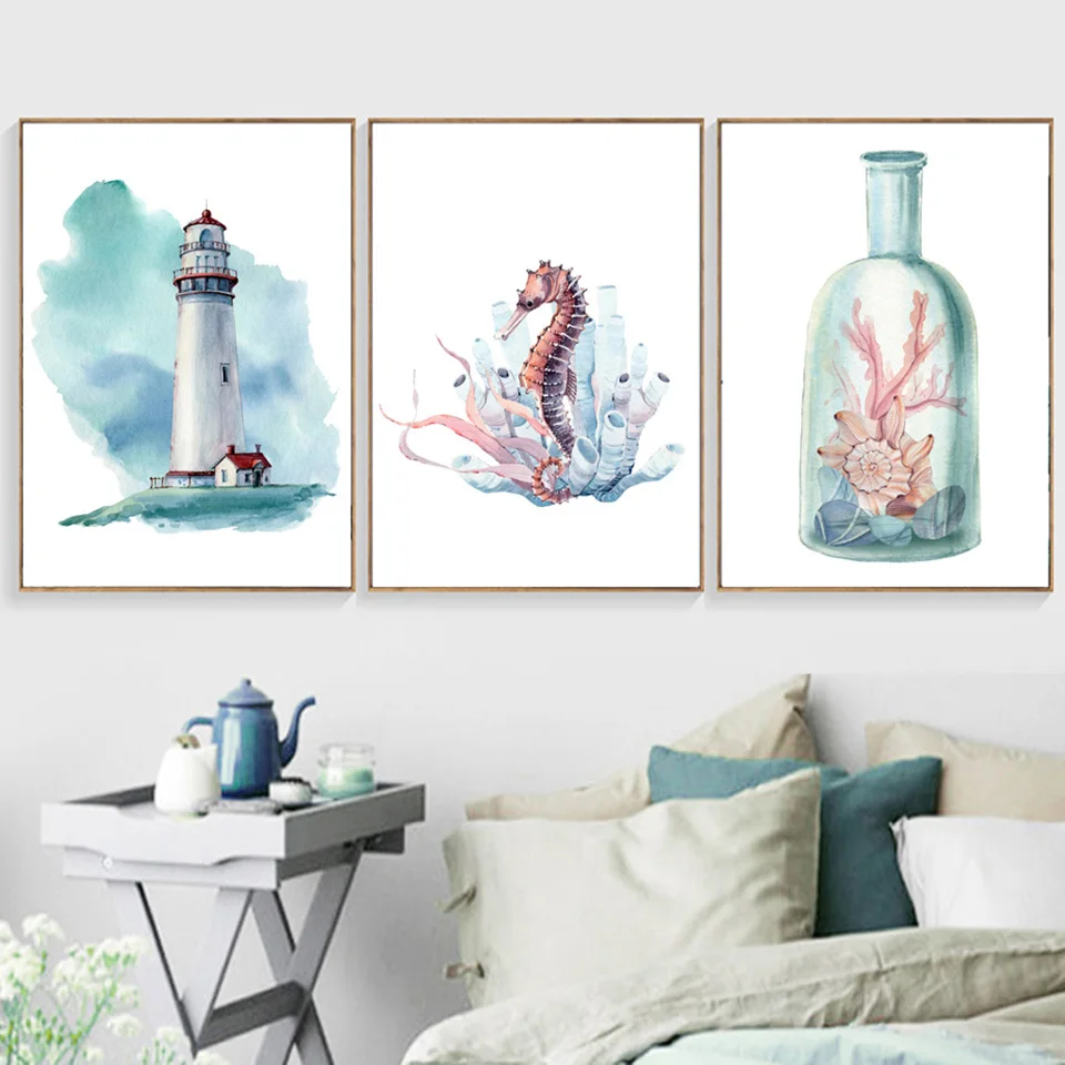 Картина на холсте в скандинавском стиле маячок морские животные картина домашний декор настенное искусство модульные картины акварельный постер для детской комнаты