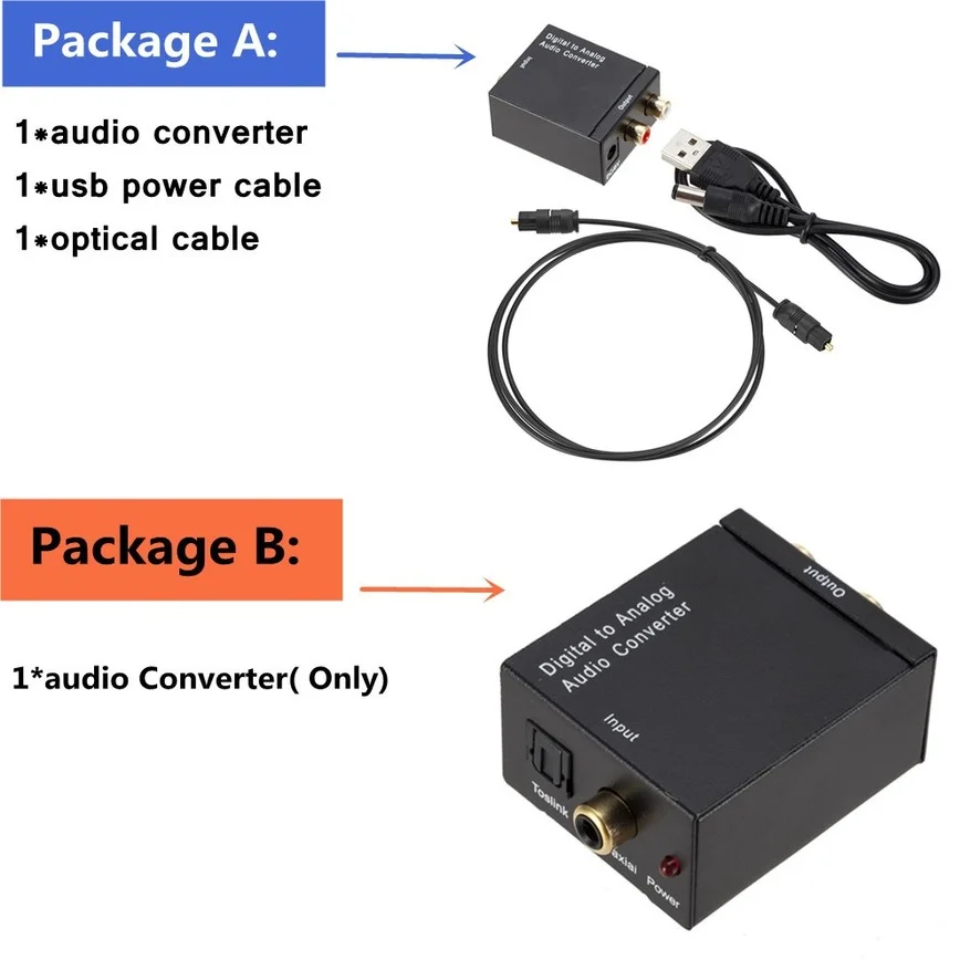 Характеристики:Цвет: черныйВходное аудио: коаксиальный или Toslink цифровой аудиоВыходное аудио: L/R аудиоВходной аудиоразъем: Toslink 1 * RCA (коаксиальный)Выходной аудиоразъем: 2 * RCA(R/L)Внешний источник питания: 5 В постоянного тока 1A (мы предлагаем usb-кабель питания, вы можете использовать кабель для подключения преобразователя к компьютеру, телевизору, усилителю или другим устройствам для питания.)Мощность Потребляемая мощность: 0,5 Вт (макс)Конвертер: FCC,CE,ULИсточник питания: UL,CE,FCCЧастота дискретизации: 32,44, 1,48 и 96 кГцРабочая температура: 0 ℃ до + 70 ℃Рабочая влажность: от 10% до 85% относительной влажности (без конденсации)Температура хранения: от-10 ℃ до + 80 ℃Влажность хранения: от 5% до 90% относительной влажности (без конденсации)Размер (ДхШхВ): 51x41x26ммВес (нетто): 78 гОсобенности:1. Преобразует коаксиальные или toslink цифровые аудио сигналы в аналоговый L/R аудио2. Доступно для подключения к внешнему устройству, например, к усилителю через стандартный RCA3. Поддерживает частоту дискретизации при 32,44, 1, 48 кГц4. 24-битный S/PDIF входящий бит потока на левые и правые каналы5. Обеспечивает электромагнитную передачу без шума6. Простота установки и простота в эксплуатации7. Компактный размер и легкий вес8. Цифровой оптический коаксиальный Toslink сигнал в аналоговый аудио конвертер предназначен для домашнего или профессионального переключения звука9. Он преобразует коаксиальные или Toslink цифровые аудио сигналы в аналоговый L/R аудио и доступноДля подключения к внешнему устройству, например, к усилителю через стандартные разъемы в стиле RCA10. Этот конвертер небольшой по размеру и довольно прост в установке.Упаковочный лист:Посылка A:1 * DAC аудио конвертер1 * оптический кабель1 * USB кабель питанияПосылка B:1 * DAC аудио конвертер (только)
