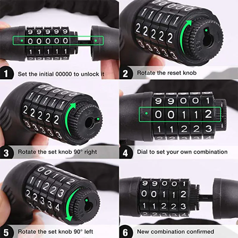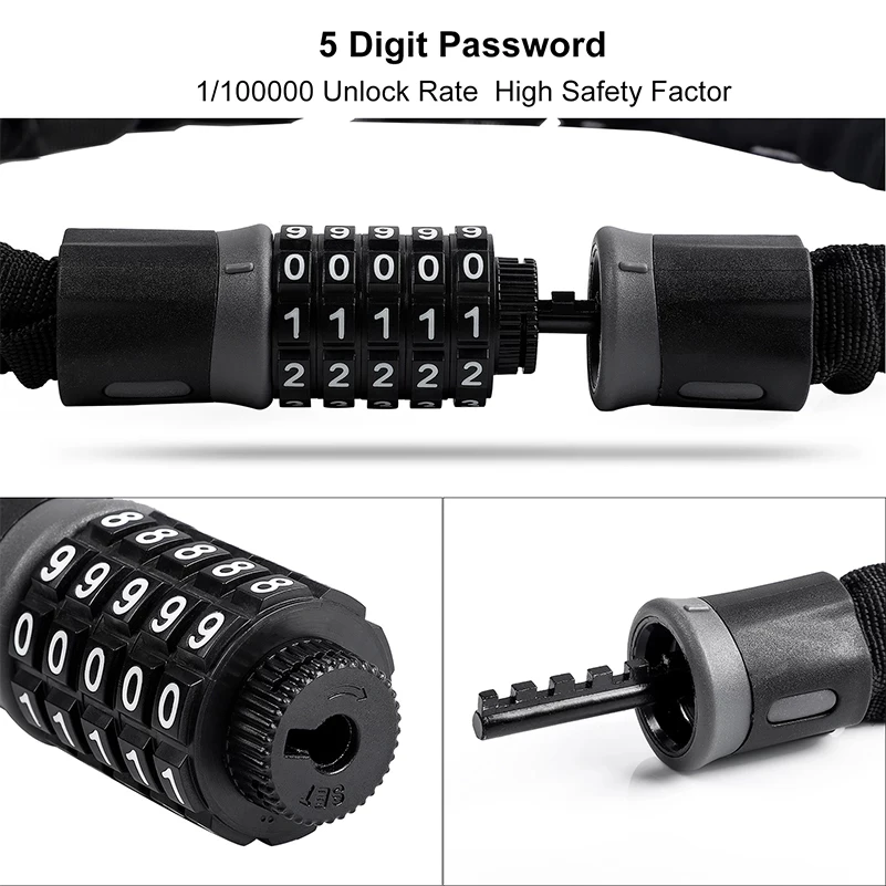 Название продукта:1. Точный 5-разрядный комбинации: технологичная 5-разрядный сочетание обеспечивает до 100000 возможных комбинациях, что делает его практически невозможно, чтобы взломать и значительно уменьшает вероятность кражи; встроенная система позиционирования обеспечивает, что циферблат можно легко повернуть на место без каких-либо цифр скольжения; Легко установить любую комбинацию; Удобно и практично в использовании без необходимости брать с собой ключи.2. Усиленный цилиндр замка из цинкового сплава: замок покрыт оболочкой ABS, которая не трескается при низких температурах и не деформируется при высоких температурах; цилиндр замка из цинкового сплава, который принимает систему уплотнения, основанную на международных стандартах и пыленепроницаемый, водонепроницаемый, сверлильный и пилостойкий.Закаленная прочность цепи: покрытая износостойкой нейлоновой втулкой, наши стальные цепи обеспечивают первоклассную устойчивость к царапинам рамы, пилению или болторезам. Этот велосипедный замок сертифицирован CE и RoHS.3. Многофункциональность: идеально подходит для велосипедов, мотоциклов, кабелей, скейтбордов, спортивного оборудования, заборов ворот, грилей, коробок, лестниц, ручных грузовиков, строительных лесов, других инструментов и многого другого.Как сбросить пароли?1. Этот замок предустановлен для работы на 00000. Чтобы установить собственную комбинацию, выполните следующие действия:2. Наберите комбинированные колеса для 00000 и отсоедините кабель.3. Поверните ручку на 90 градусов по часовой стрелке в указанное положение.4. Сброс комбинированных колес до нужной комбинации, убедитесь, что цифры выстроены указателем.5. Выберите комбинированные номера, поверните ручку обратно в исходное положение против часовой стрелки.6. Новая комбинация сейчас установлена.7. Повторите 1-5 шагов выше, чтобы сбросить комбинацию в любое время.Пакет включает в себя:1x инструмент для демонтажа цепи велосипеда (замок