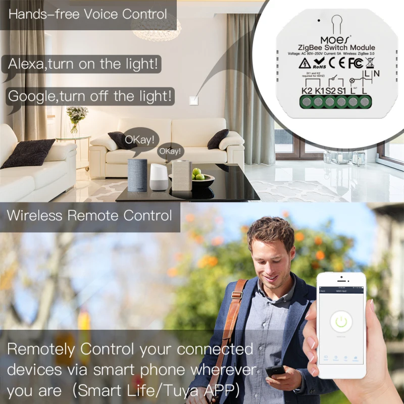 Конвертируйте большинство любых совместимых продуктов в умные; Традиционный переключатель и этот умный модуль может работать