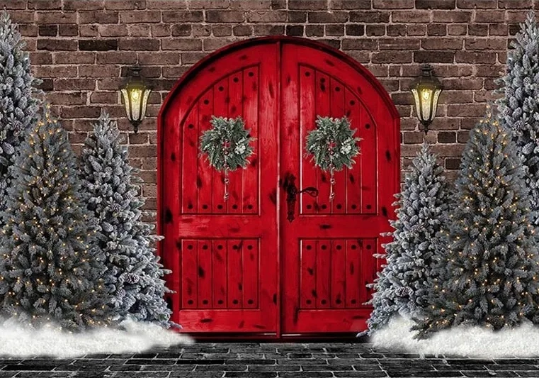 Фон для фотографий Рождество Зима Снег Рождественская елка винтажная кирпичная стена красная деревянная дверь фотостудия Детские фотографии