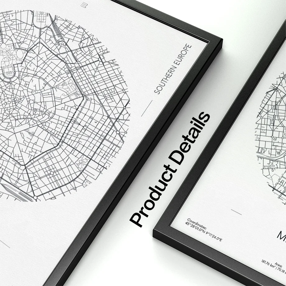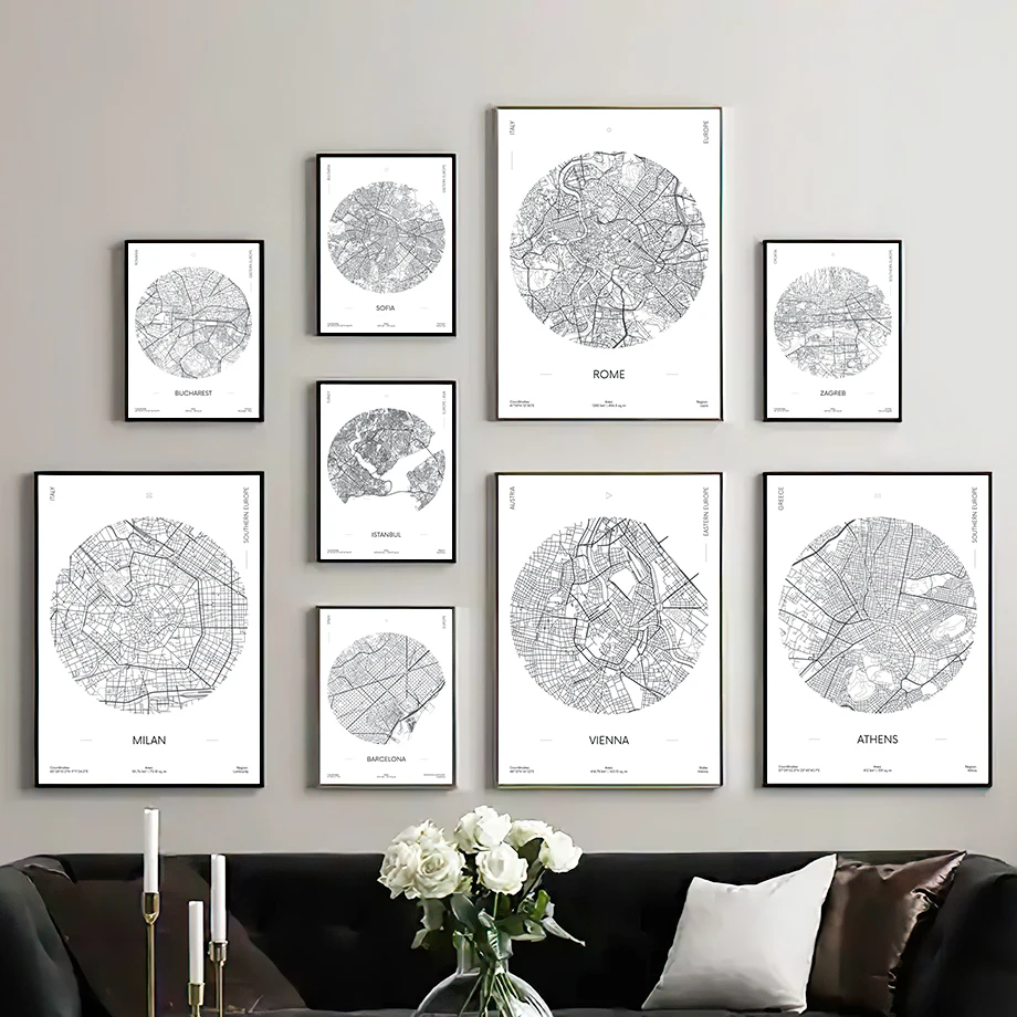 Картина на холсте Милан, Рим, Берлин, черно-белая карта города, принты в скандинавском стиле, настенные картины для гостиной