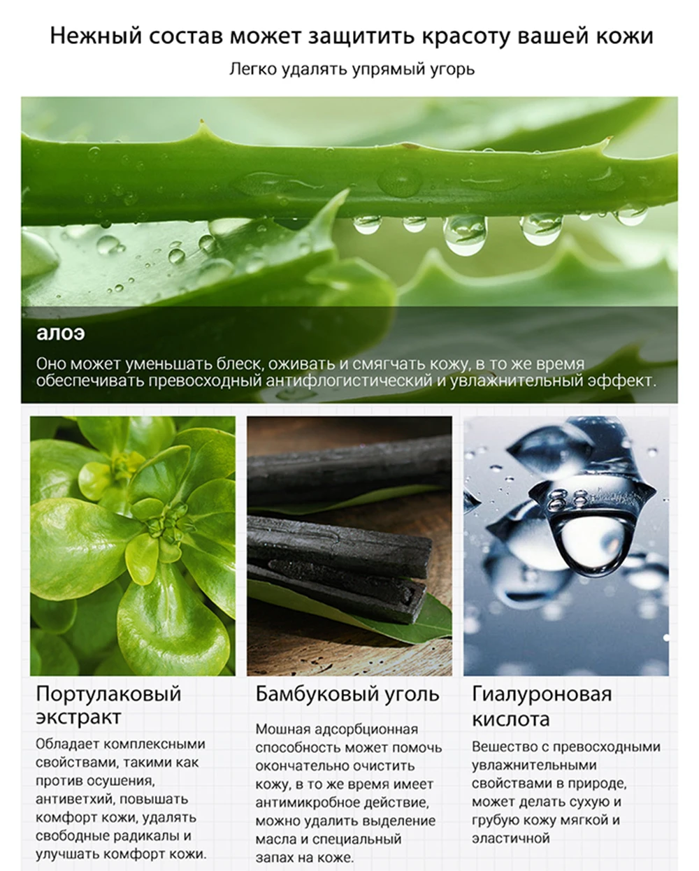 Ингредиент: алоэ, лактат натрия, экстракт олерацеи портулака, дикалий глициризинец, уголь, гиалуроновая кислота
