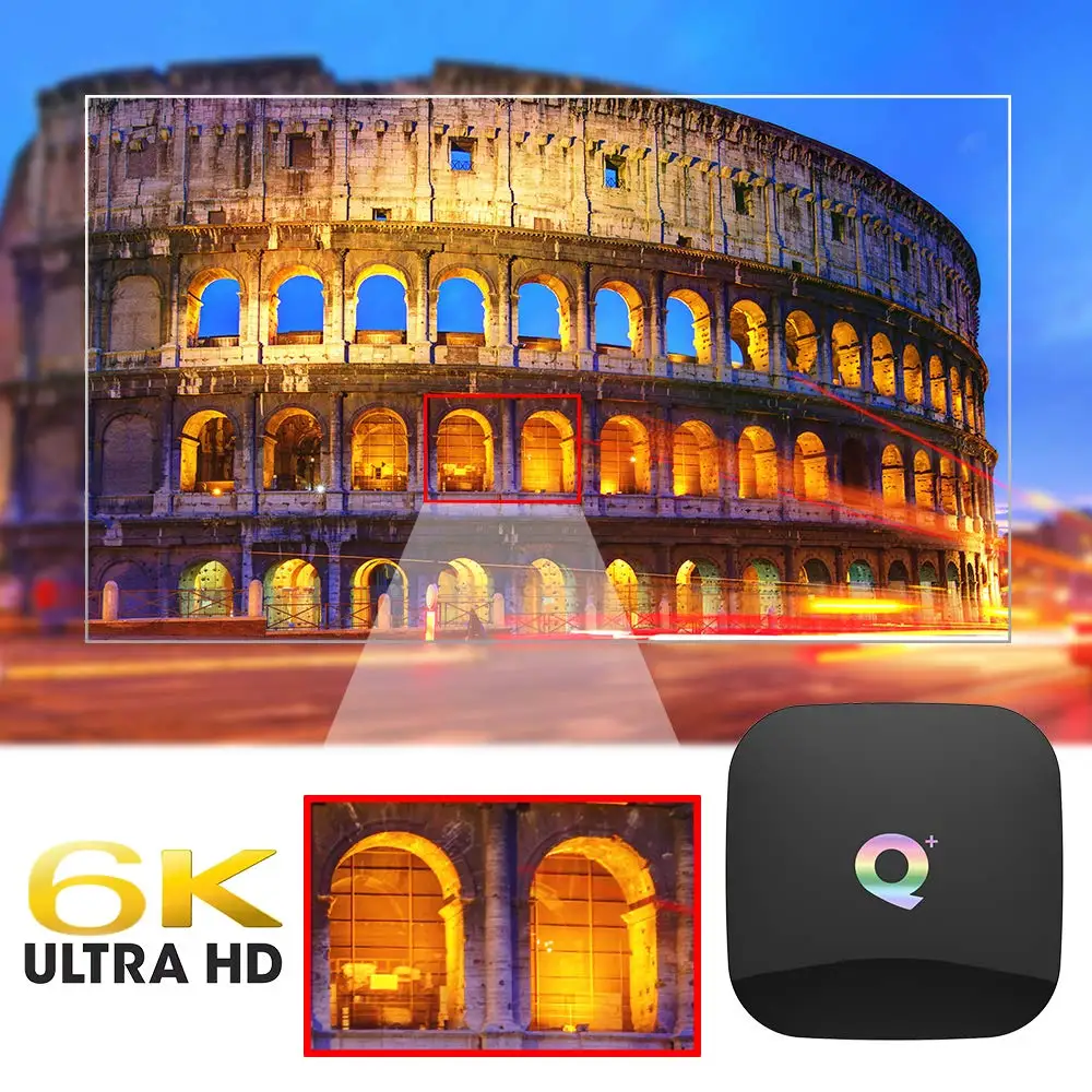 2. Поддержка 6K и 3D: Нет необходимости ходить в кинотеатр, чтобы смотреть 3D фильм, Q plus box обновленная версия поддерживает функцию 6k и 3D. Этот последний ТВ-приставка Q plus android поддерживает декодирование и воспроизведение почти всех популярных аудио и видео форматов, вы можете наслаждаться 6K ultimate HD видео, что более чётко, чем 4K. Вы можете играть в тысячи игр на android на большом экране 6K и наслаждаться более высоким качеством с меньшим количеством буферизации.