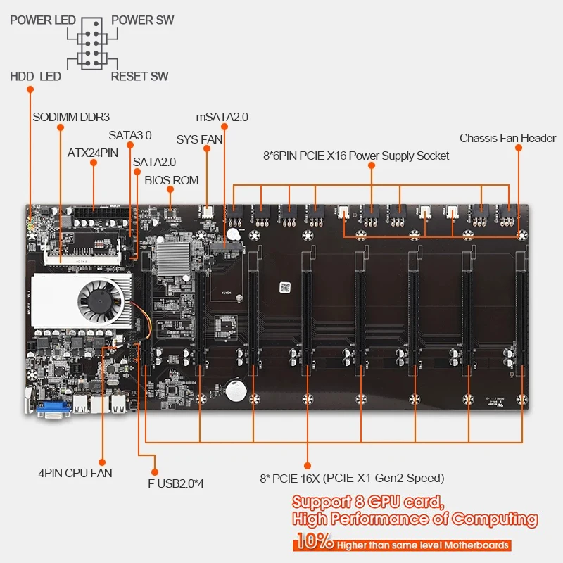Этот продукт представляет собой Комплект центрального процессора материнской платы горнодобывающей машины с низким энергопотреблением, низким тепловыделением, энергосбережением и безопасен в использовании.Особенность:1. Слот для памяти, 8 разъемов для видеокарты.